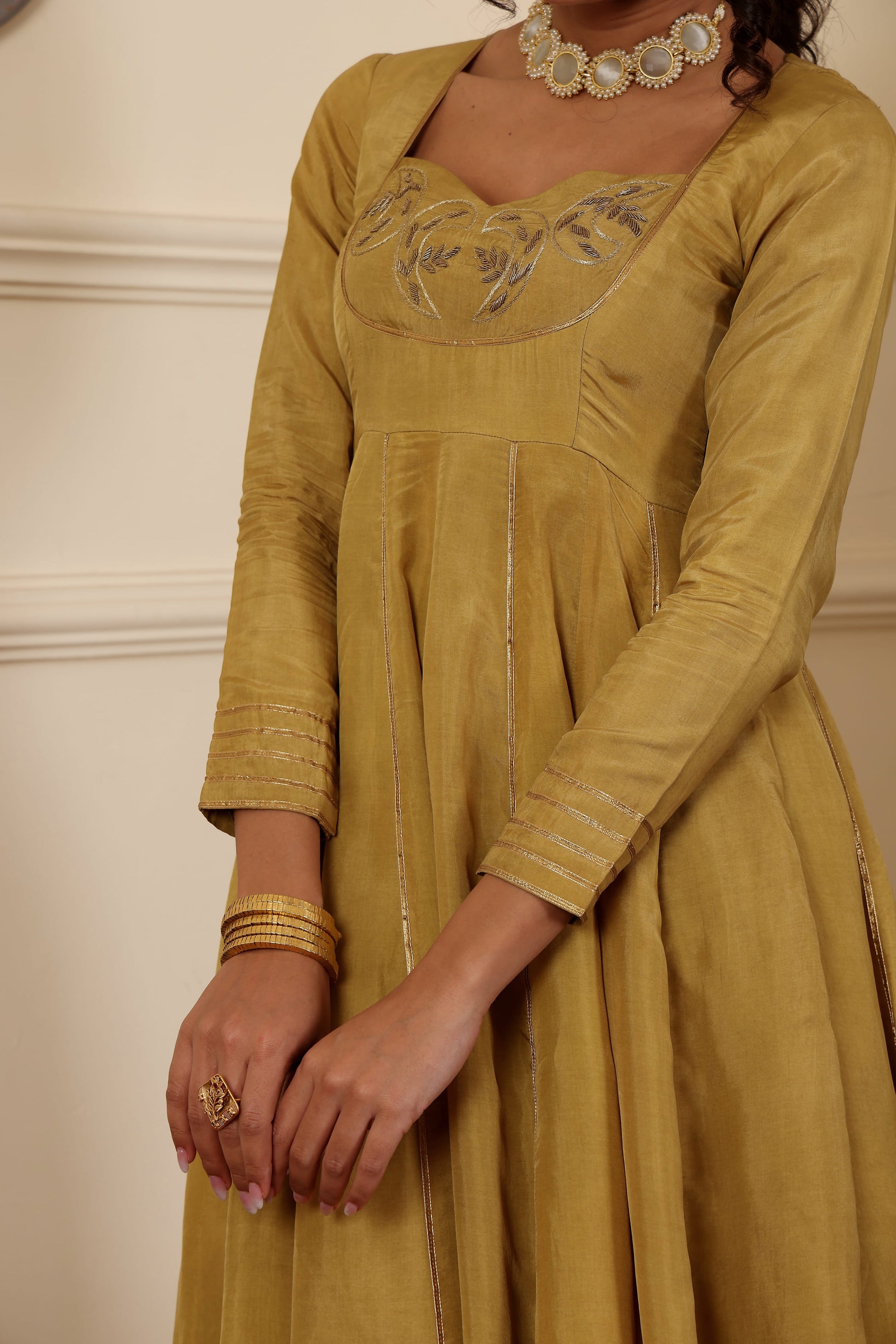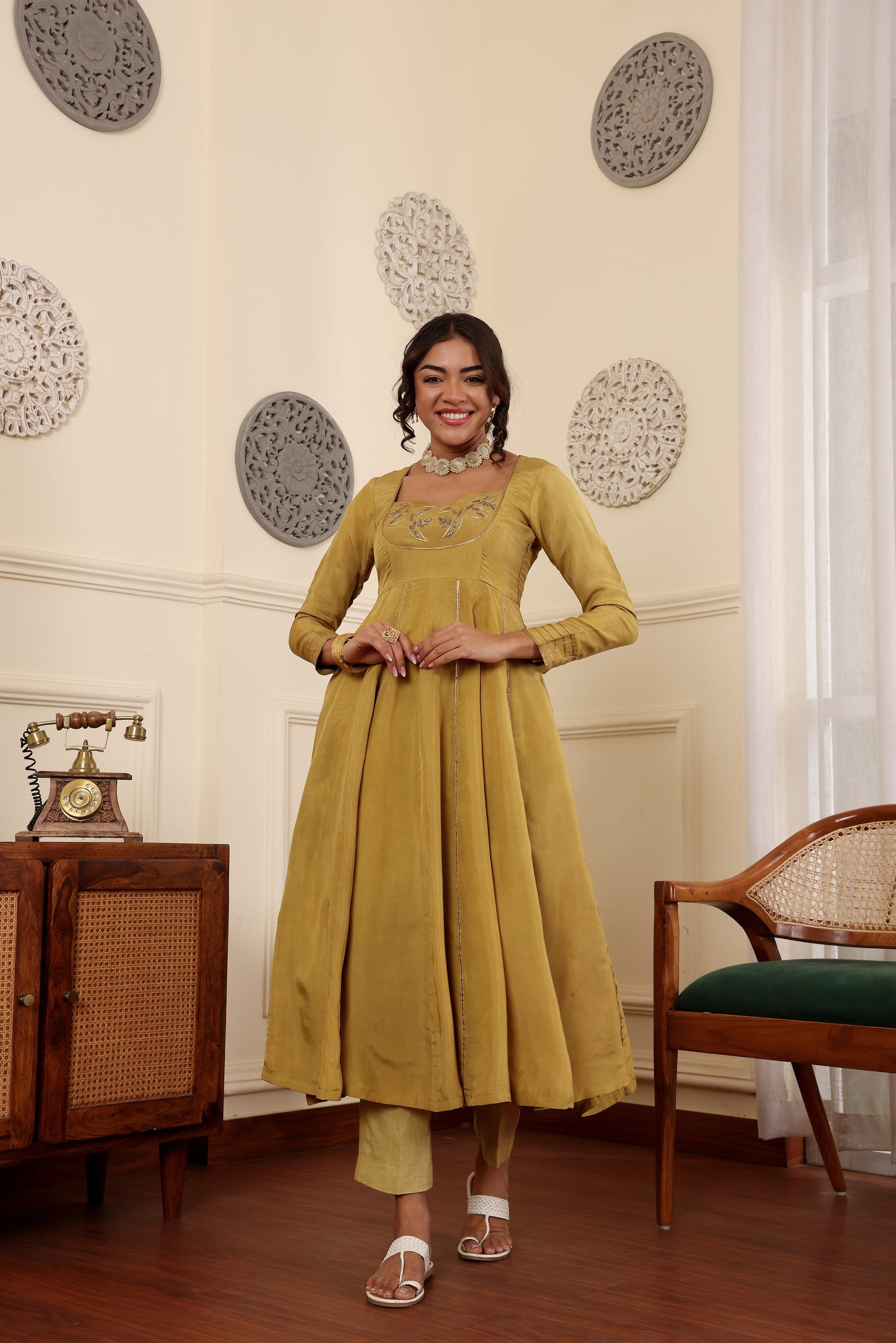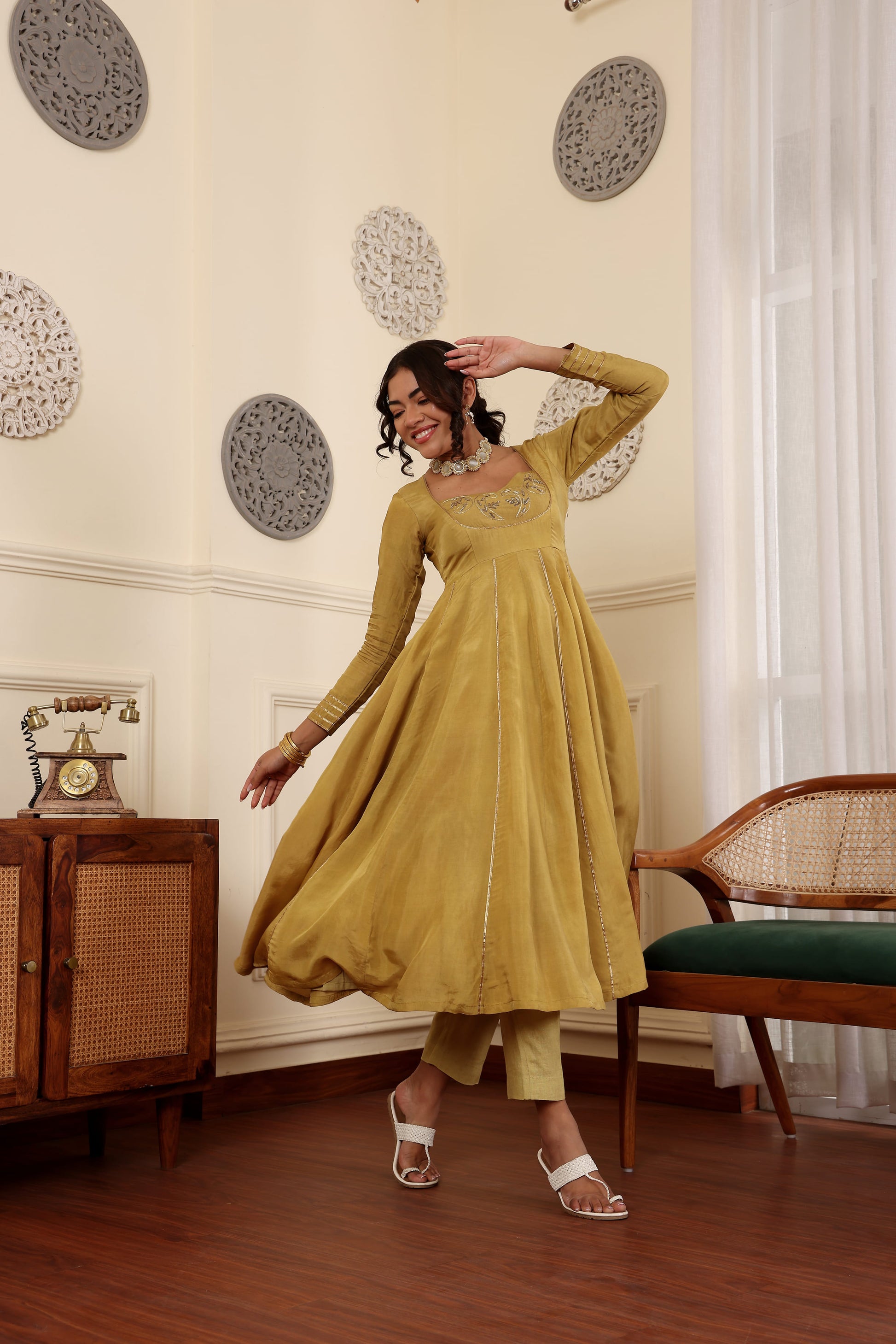 ✅ Color: Matcha Green Anarkali with a pink embroidered organza dupatta