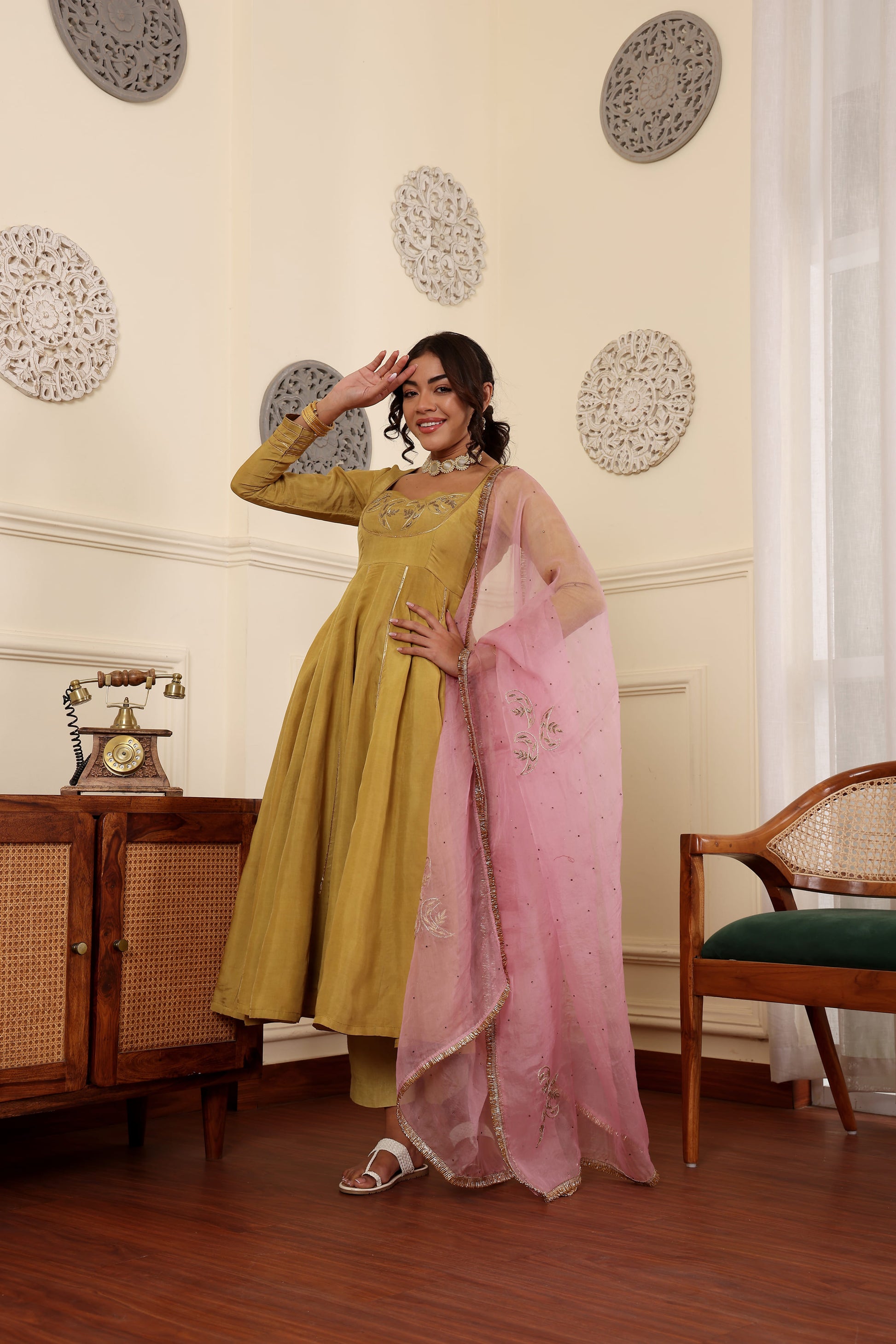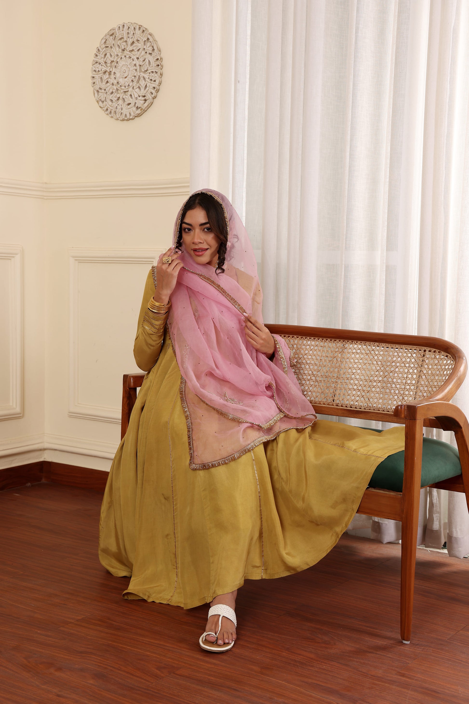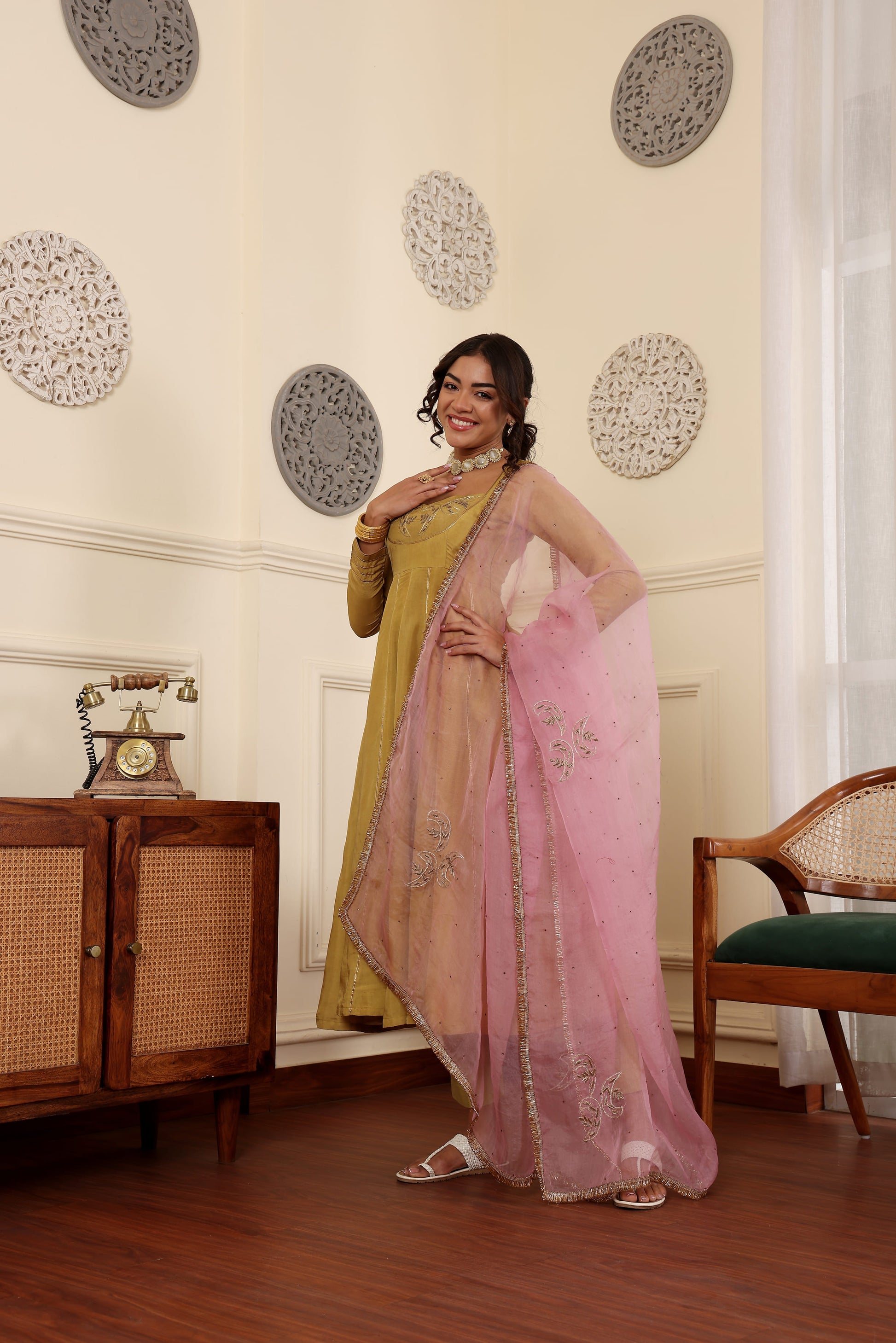 Matcha Green Silk Anarkali Set with Pink Organza Dupatta ✨💚🌸