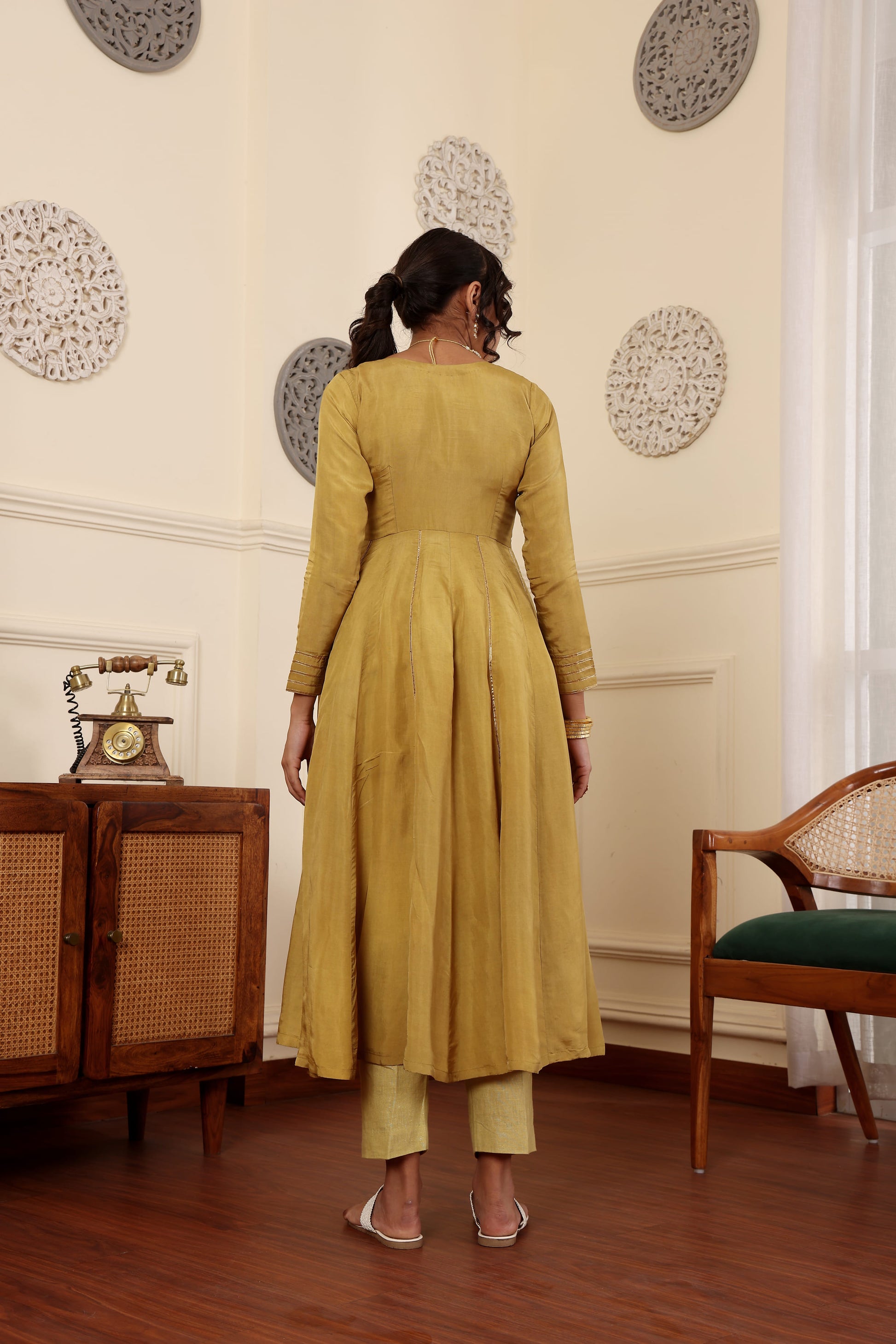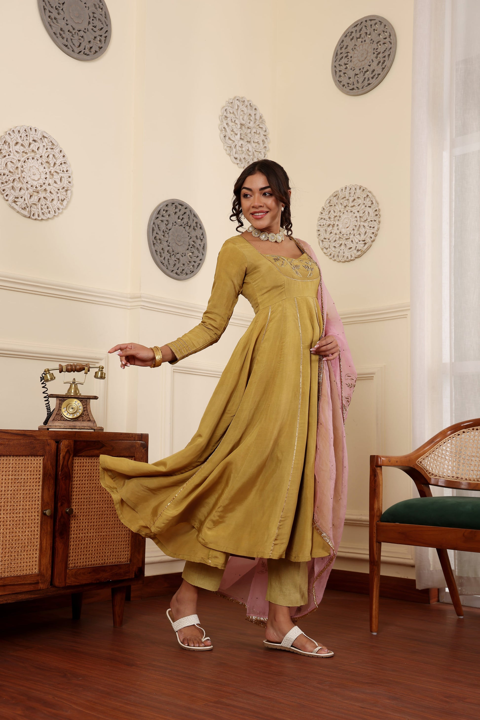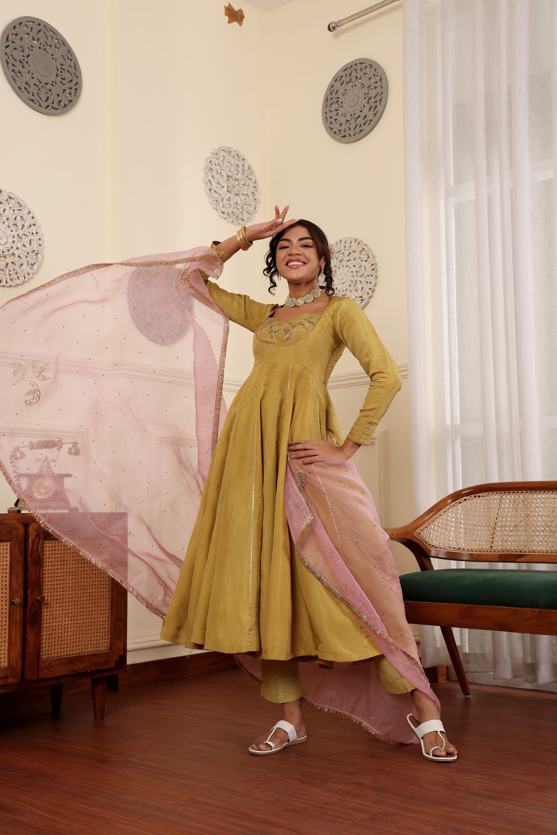 Matcha Green Silk Anarkali Set with Pink Organza Dupatta ✨💚🌸