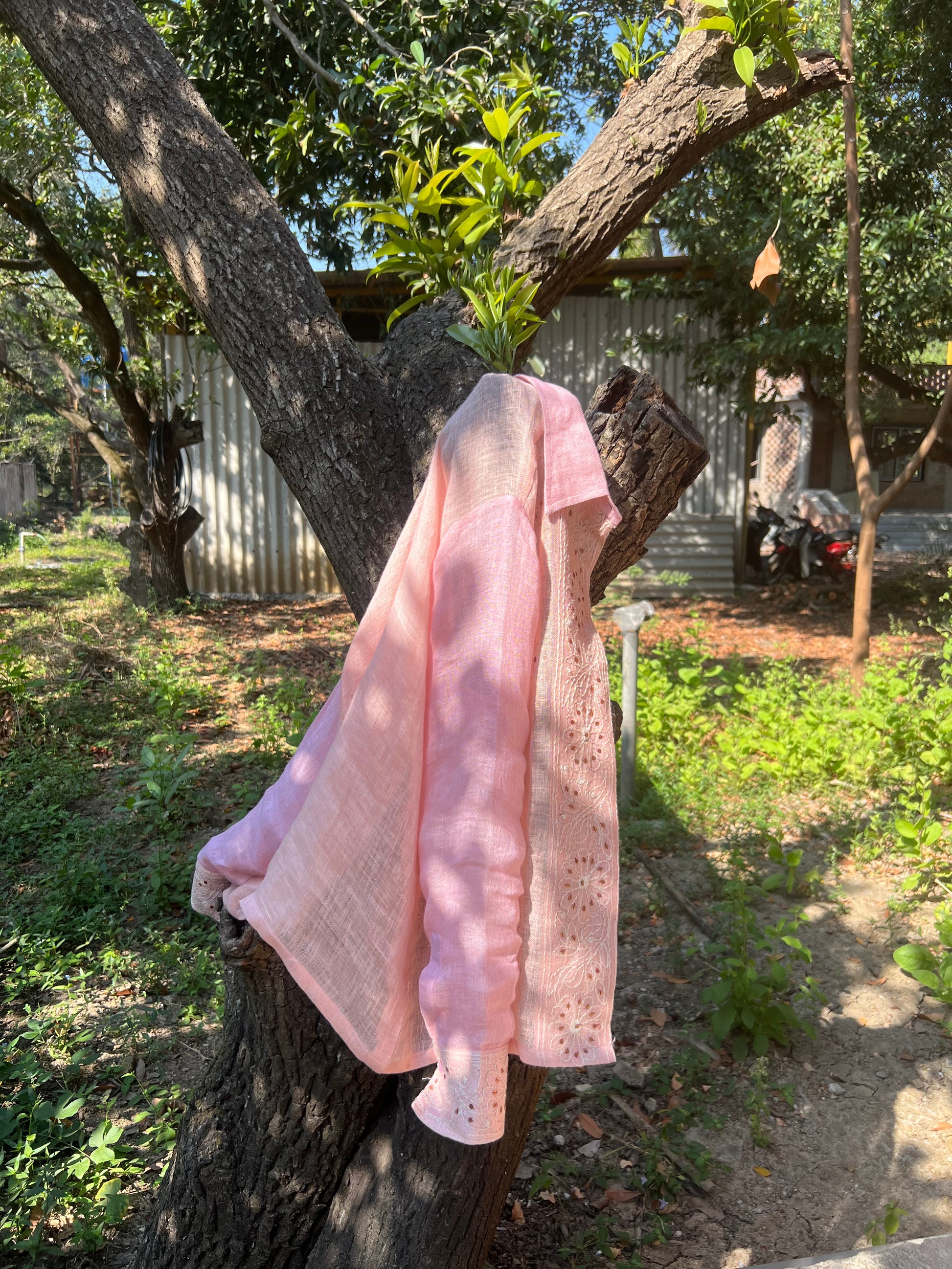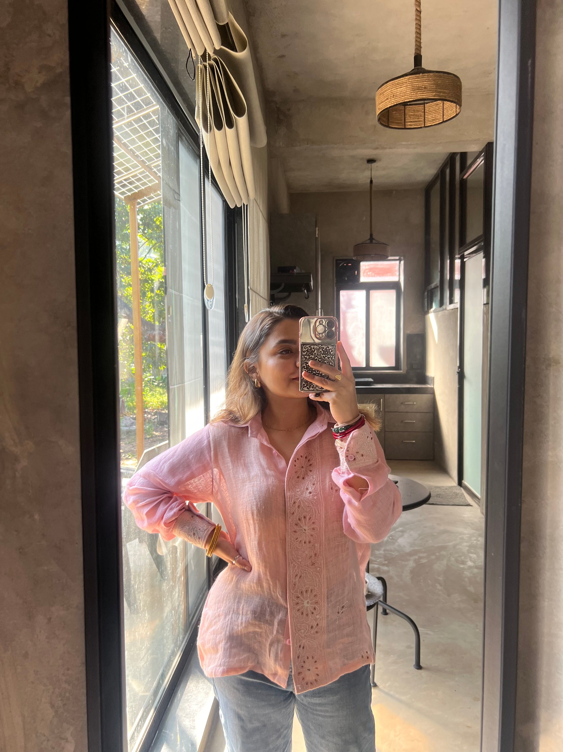 Envelop yourself in the soft blush of dawn with the Pink Wink Shirt, a pure linen masterpiece adorned with intricate Resham embroidery and shimmering sequins. Fine silk threads weave delicate patterns across the lightweight linen, while tiny sequins catch the light like morning dew on petals. Each stitch is a testament to time-honored craftsmanship, resulting in a garment as enchanting and unique as the break of day.