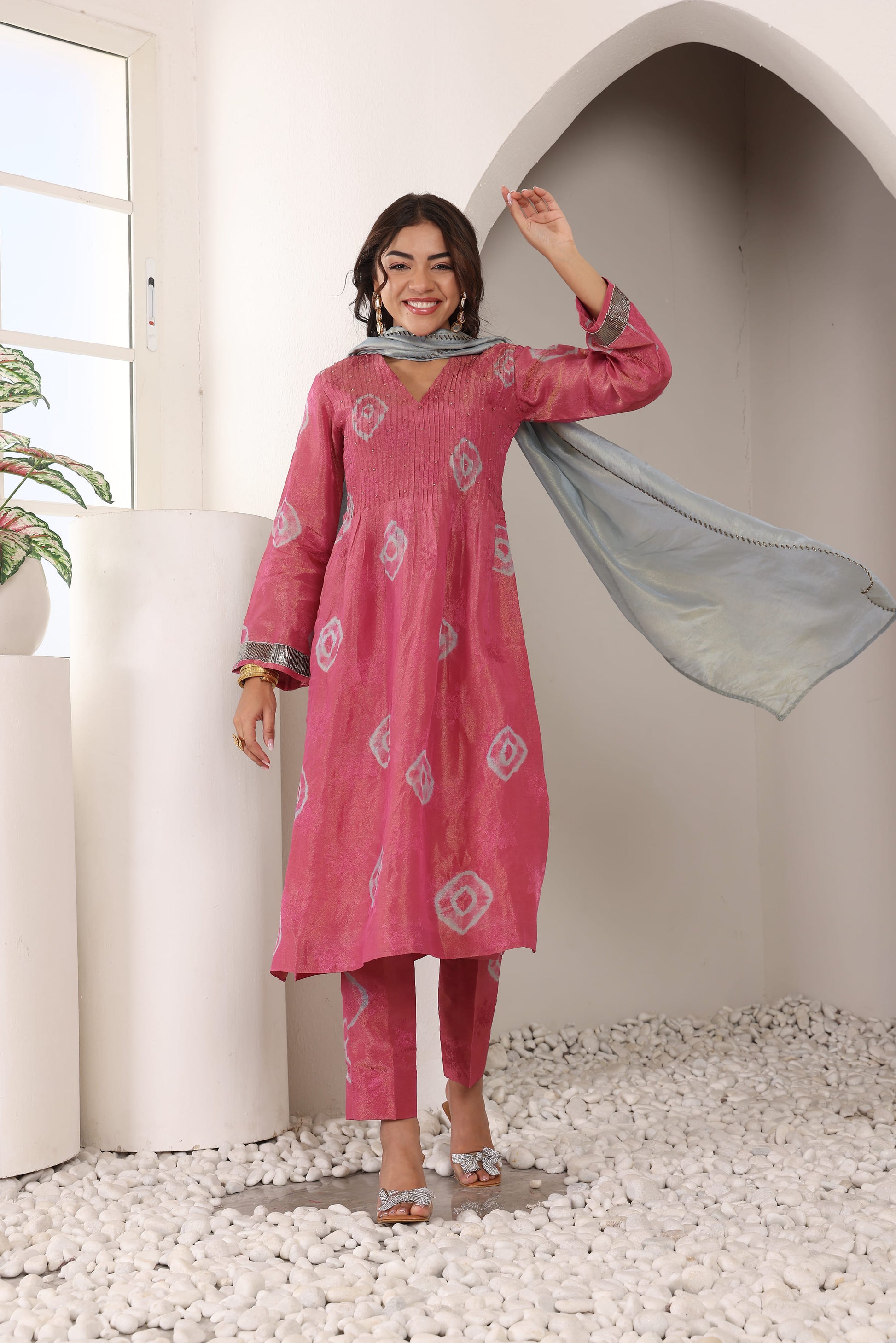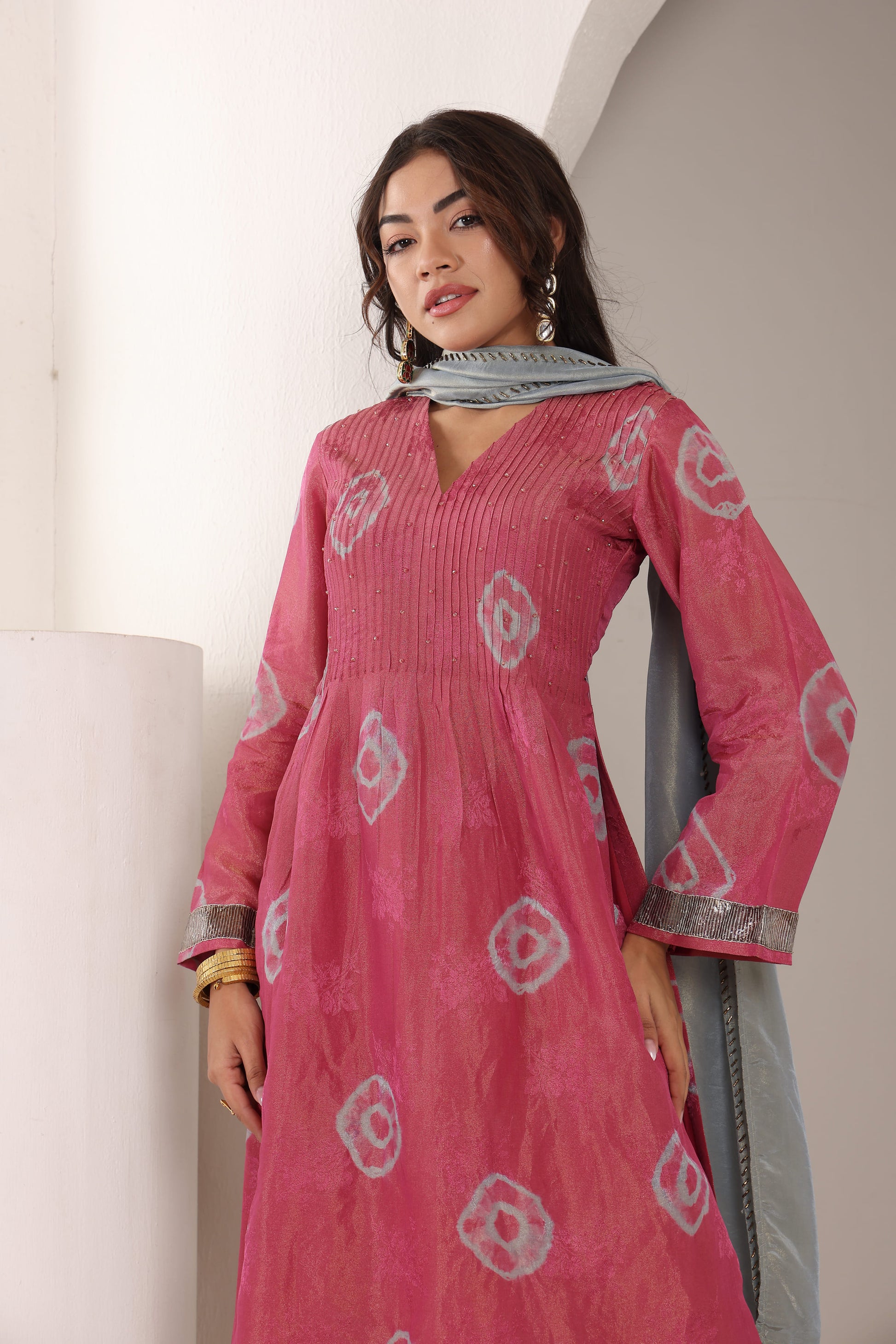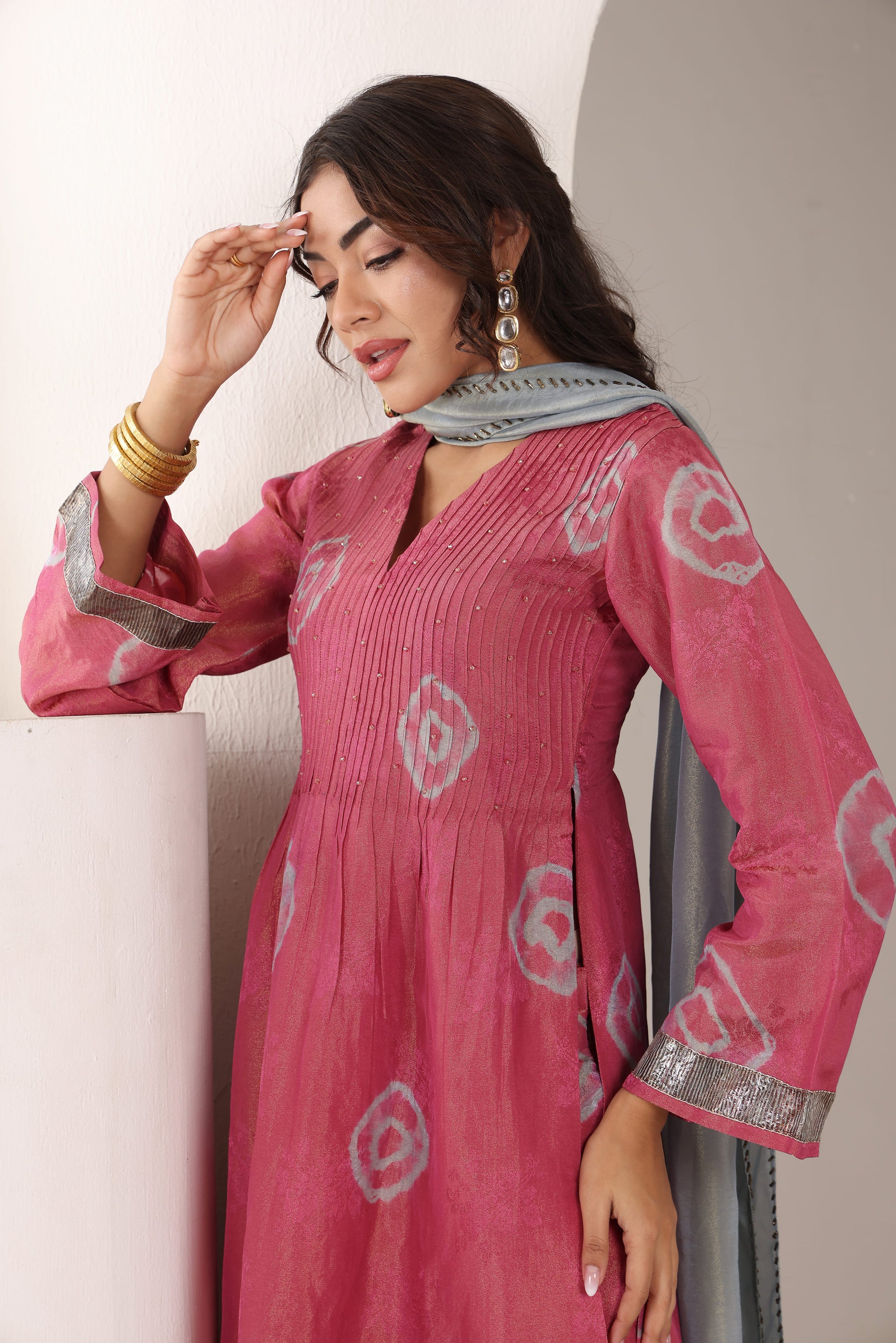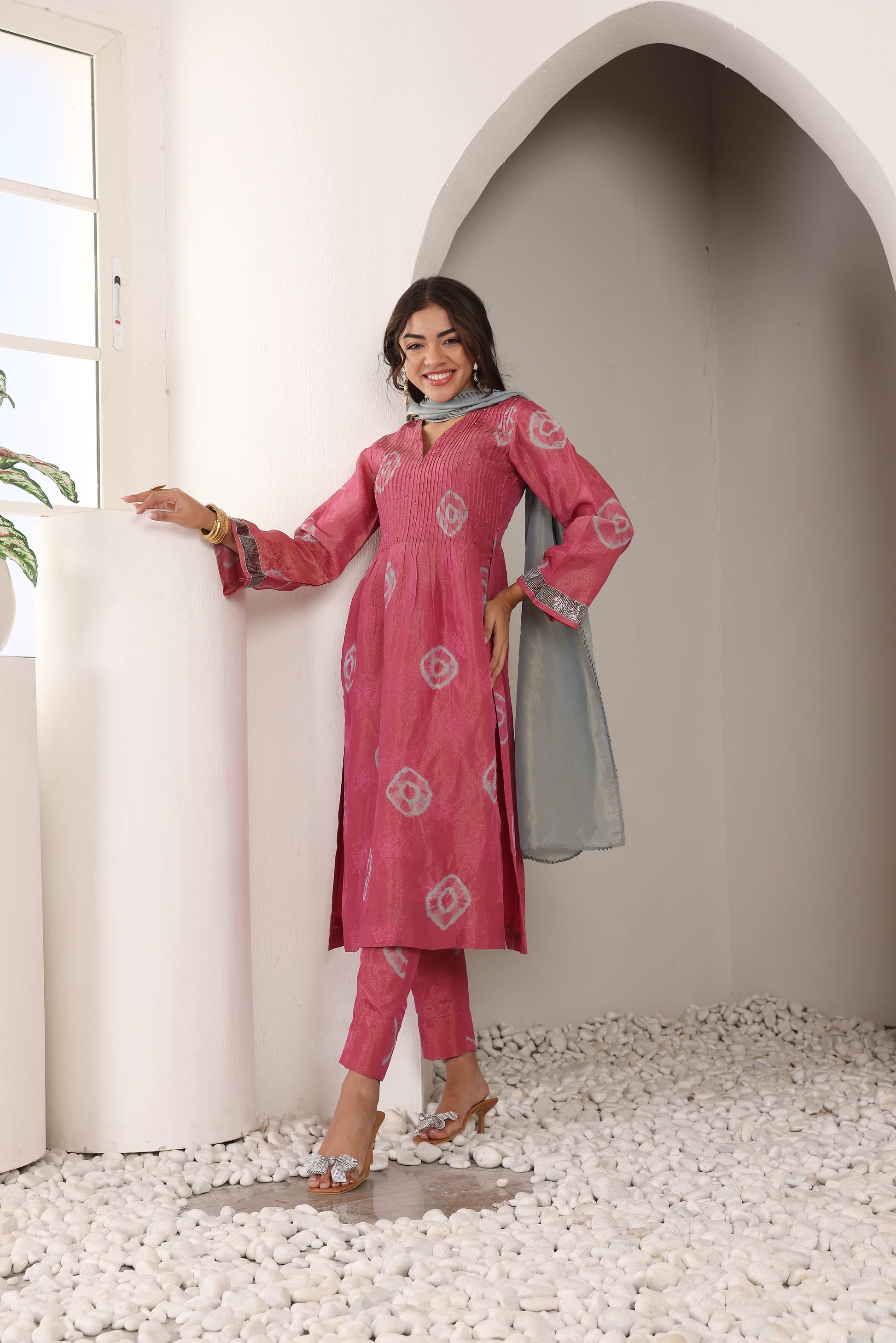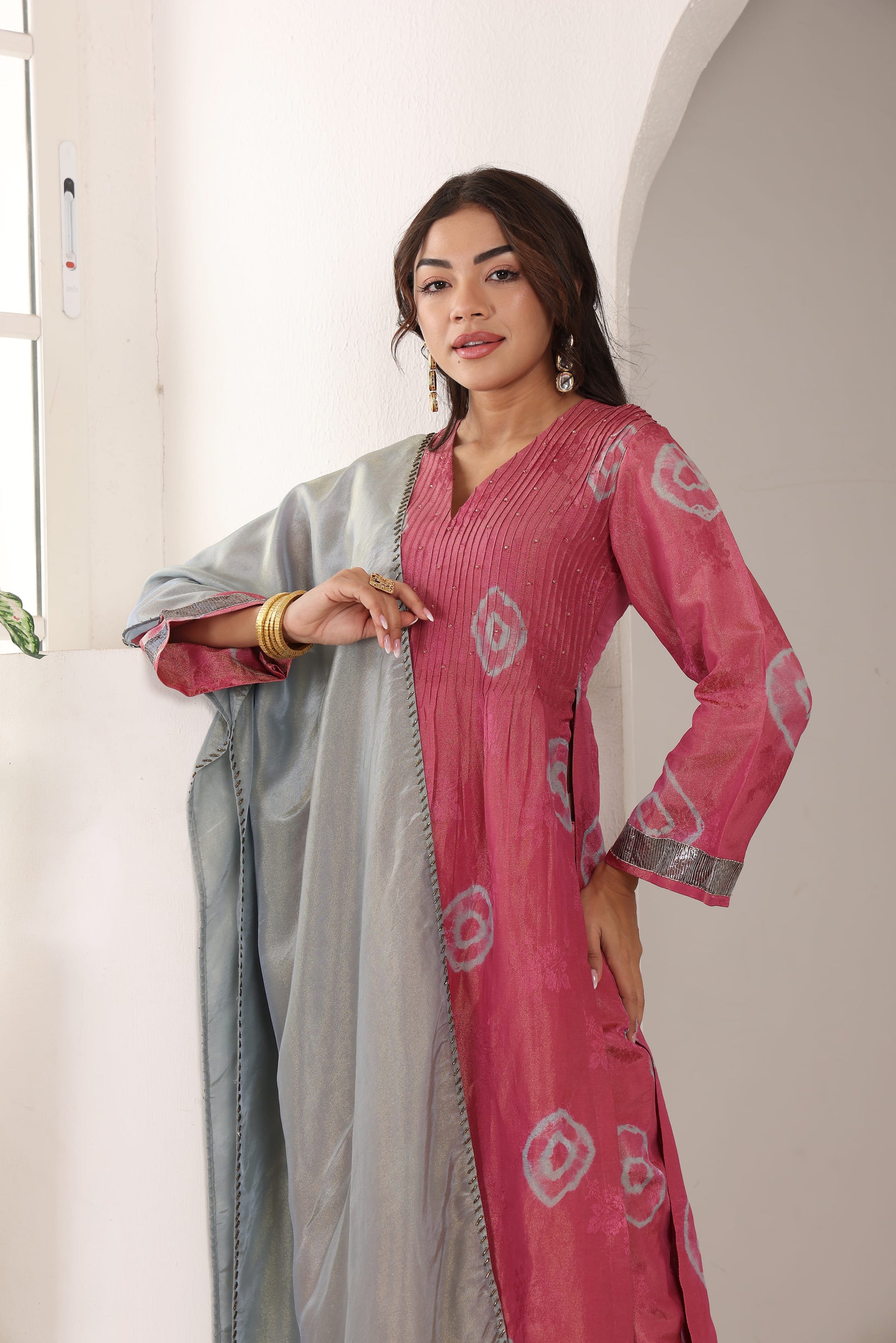 Elevate your ethnic wardrobe with Rose Charm, a stunning hand tie & dye silk tissue kurta set in batik Bandhani that exudes timeless elegance. Crafted from luxurious embossed silk tissue fabric, the kurta features delicate pin-tuck detailing on the yoke and a graceful three-quarter sleeve with intricate silver embossed borders. The traditional hand tie & dye technique adds an artisanal touch, making each piece uniquely beautiful.