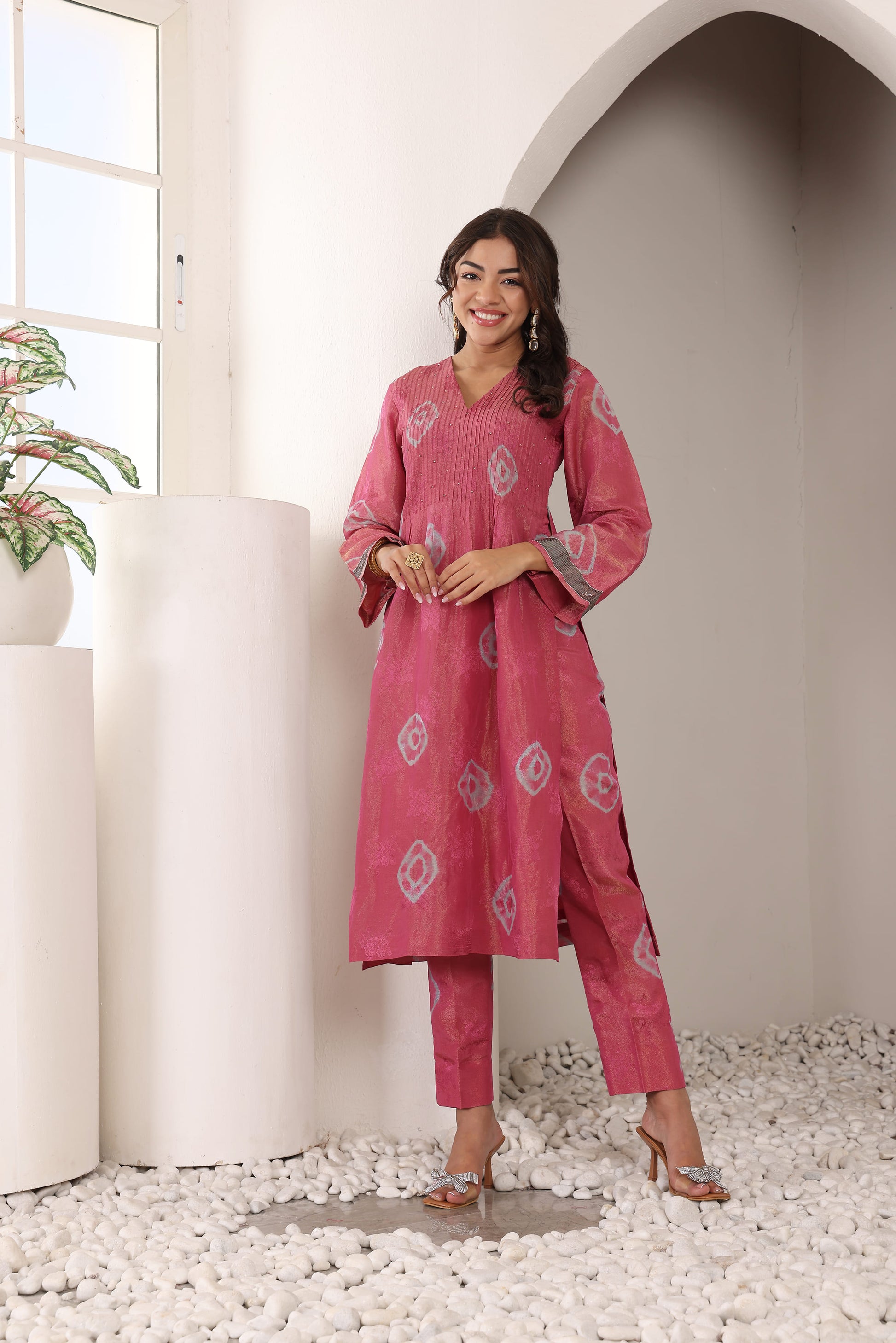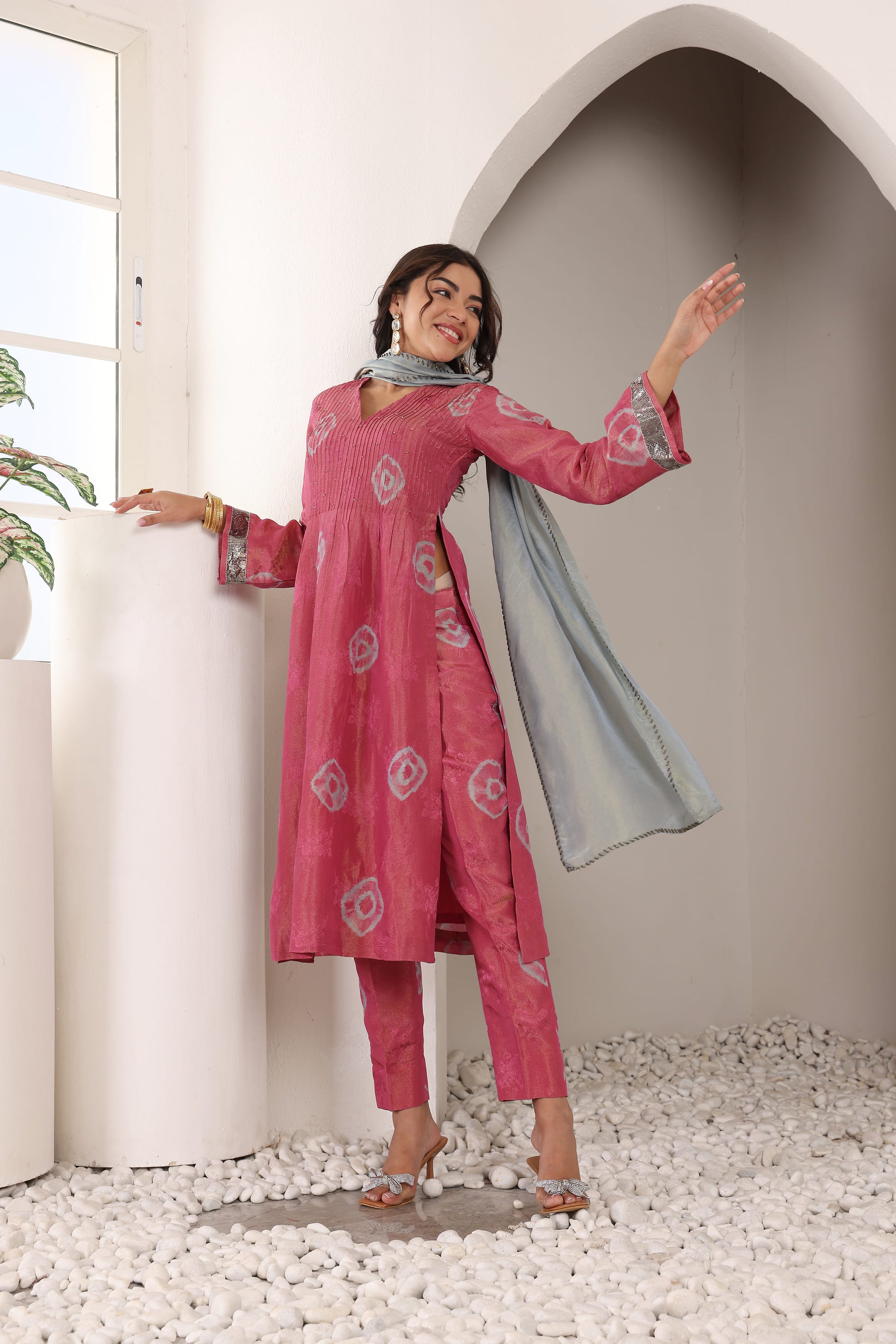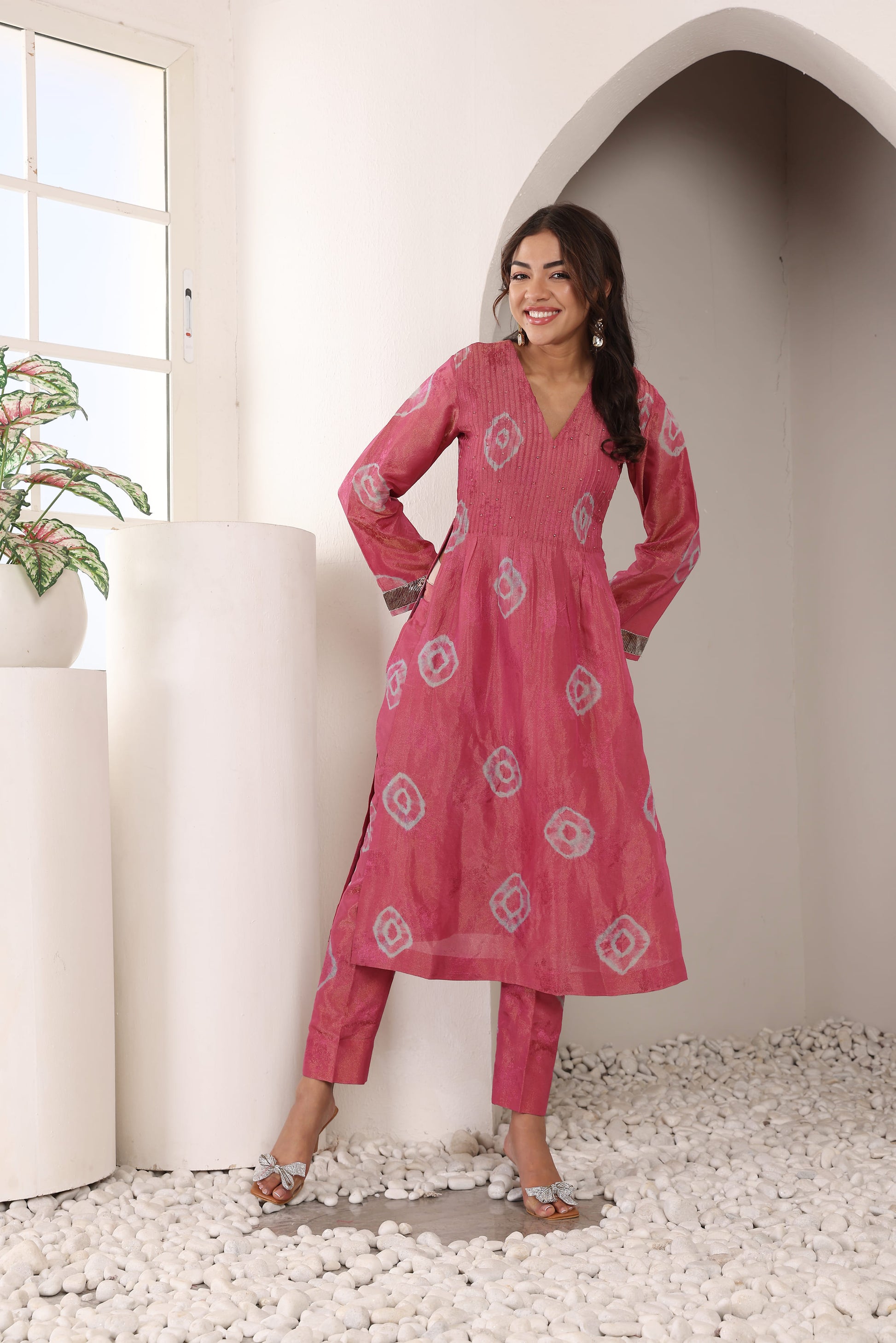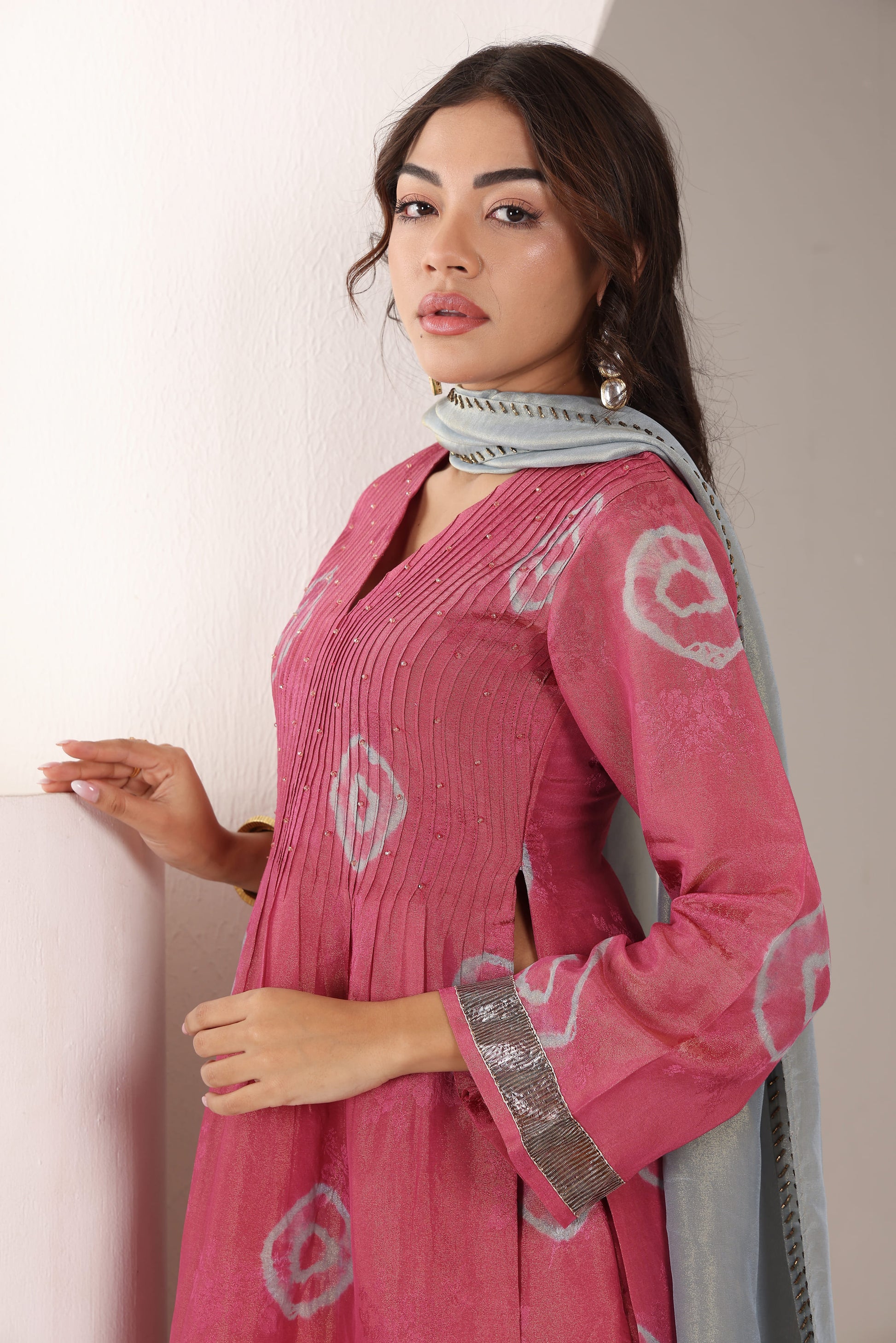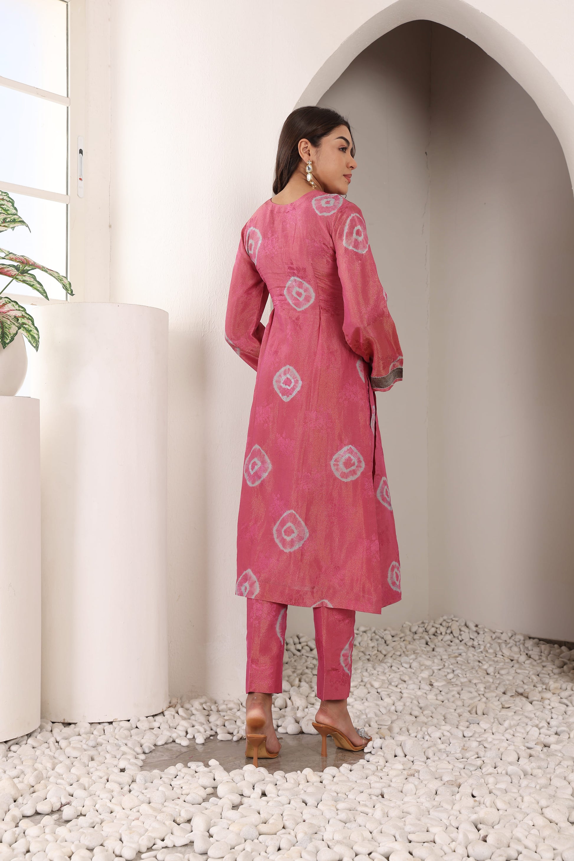 Elevate your ethnic wardrobe with Rose Charm, a stunning hand tie & dye silk tissue kurta set in batik Bandhani that exudes timeless elegance. Crafted from luxurious embossed silk tissue fabric, the kurta features delicate pin-tuck detailing on the yoke and a graceful three-quarter sleeve with intricate silver embossed borders. The traditional hand tie & dye technique adds an artisanal touch, making each piece uniquely beautiful.