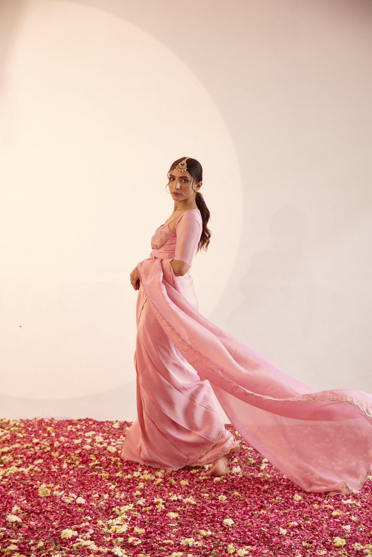 As the name suggests fig pineapple saree is a makeshift of our very own Saree collection, we have been wanting to get our ladies. Fabric being silk tissue dyed in the hues of powder pink with dabka and pearl pineapple motifs very finely, embellished on the blouse and saree for you, by our karigurs doing it right every damn time.