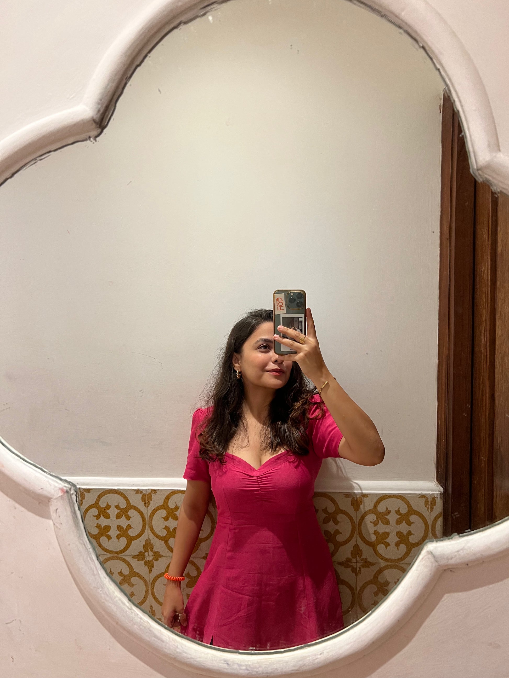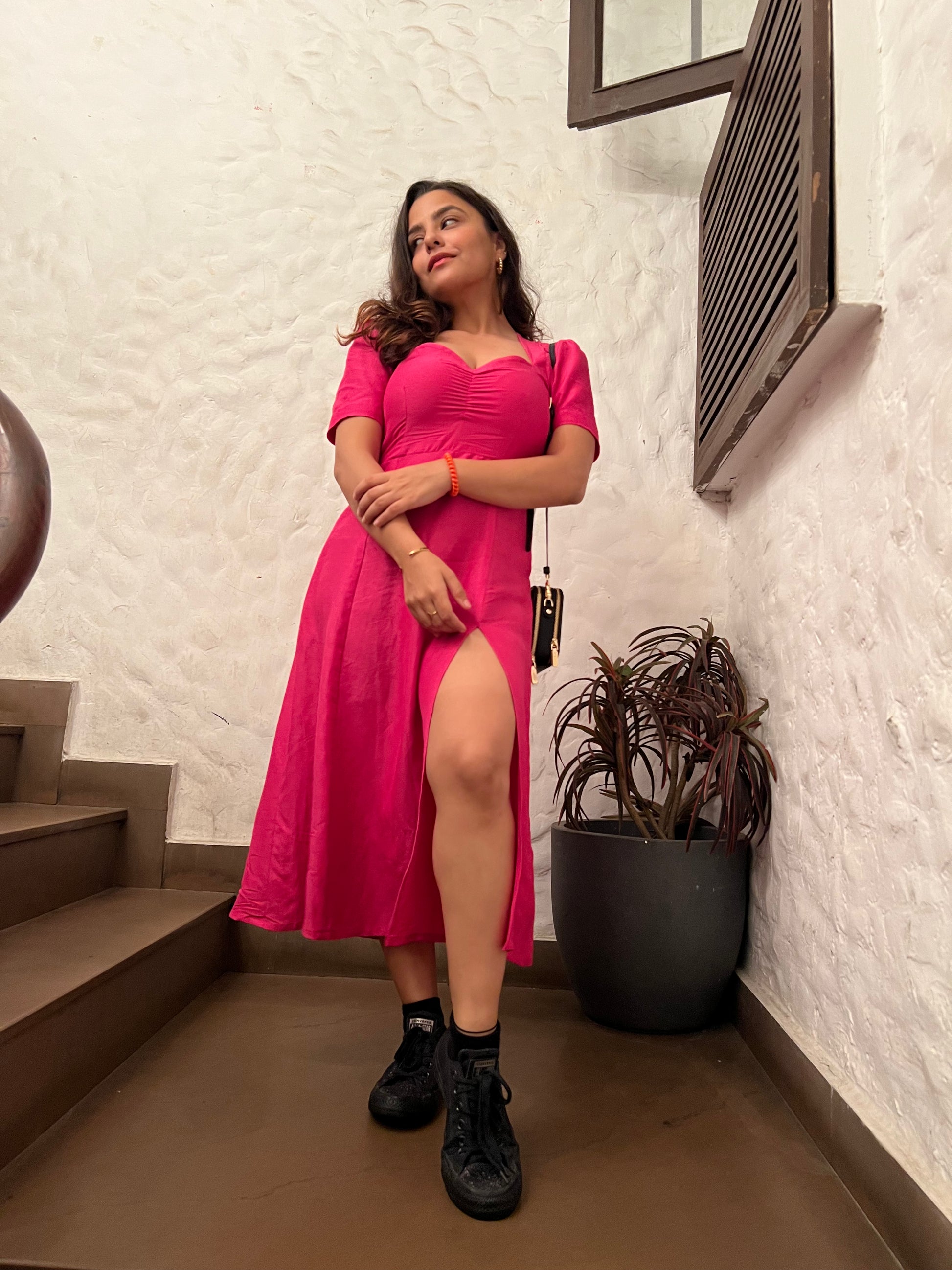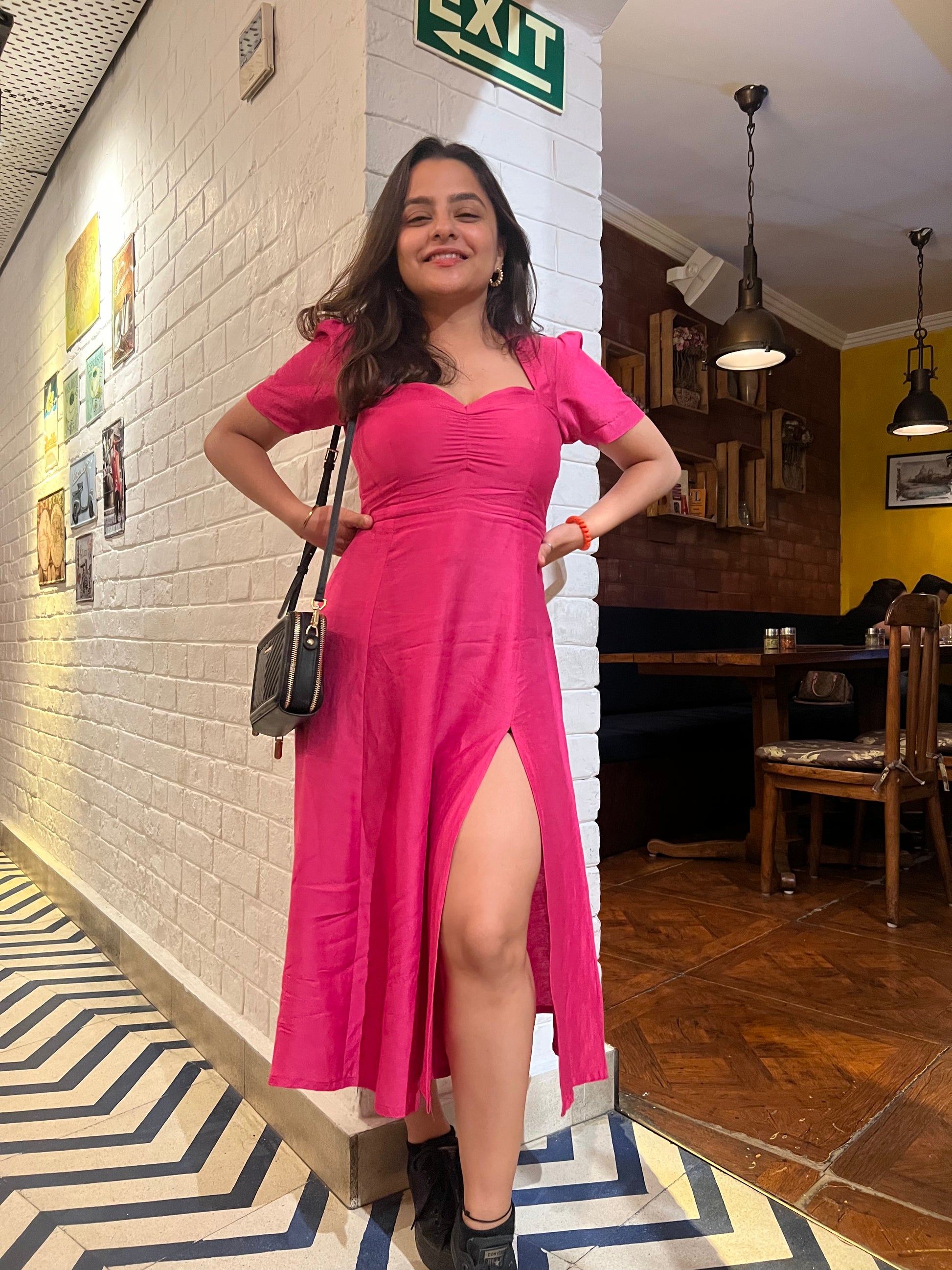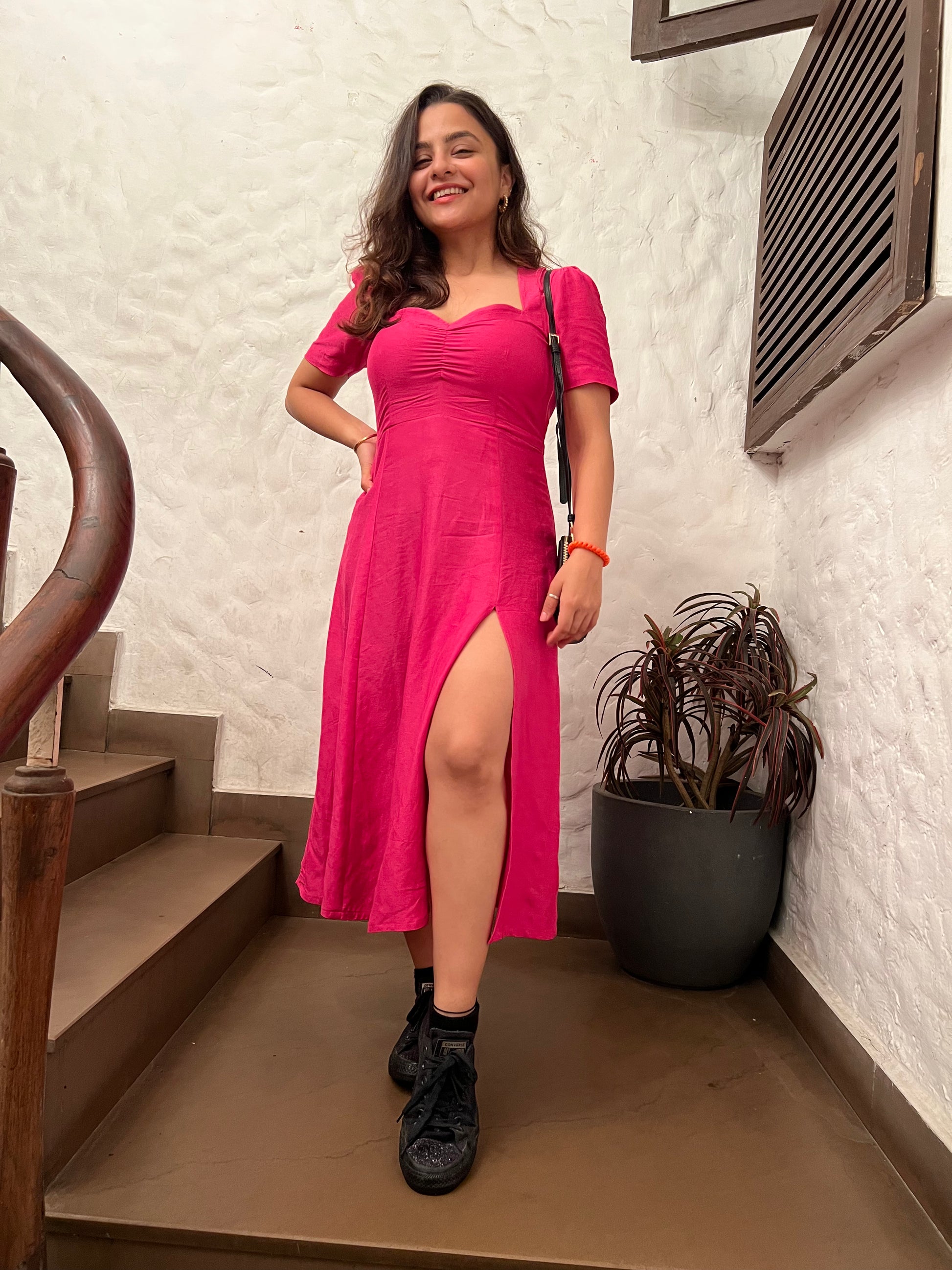 Our Rose Shiraz is a linen satin blend dress, which is a mix of satin soft finish on the inside, feels you like butter. Granier on the outside, just like linen feels rich and classy. The Barbie fever was on and so did we want to add this to our pink collection.