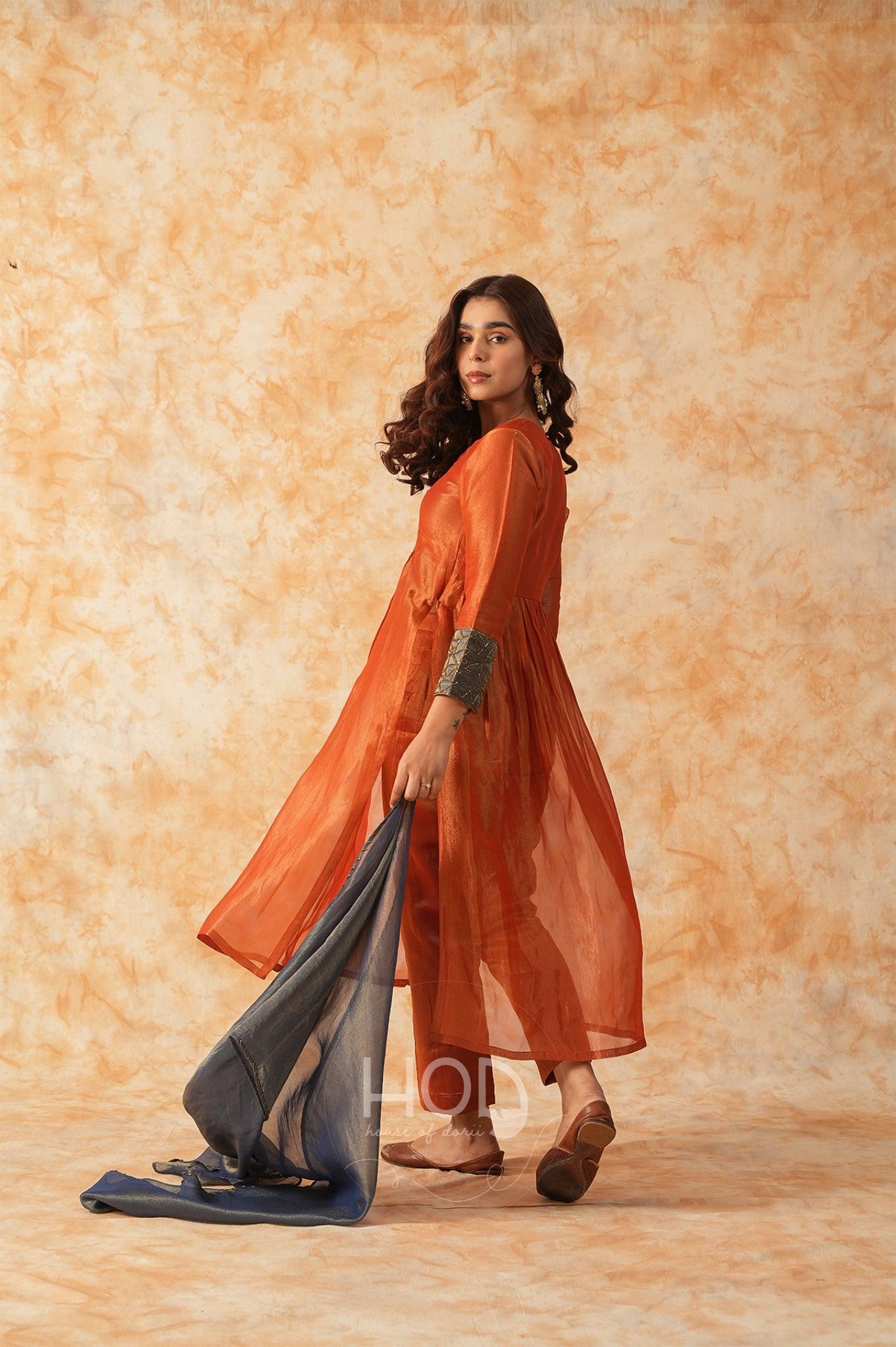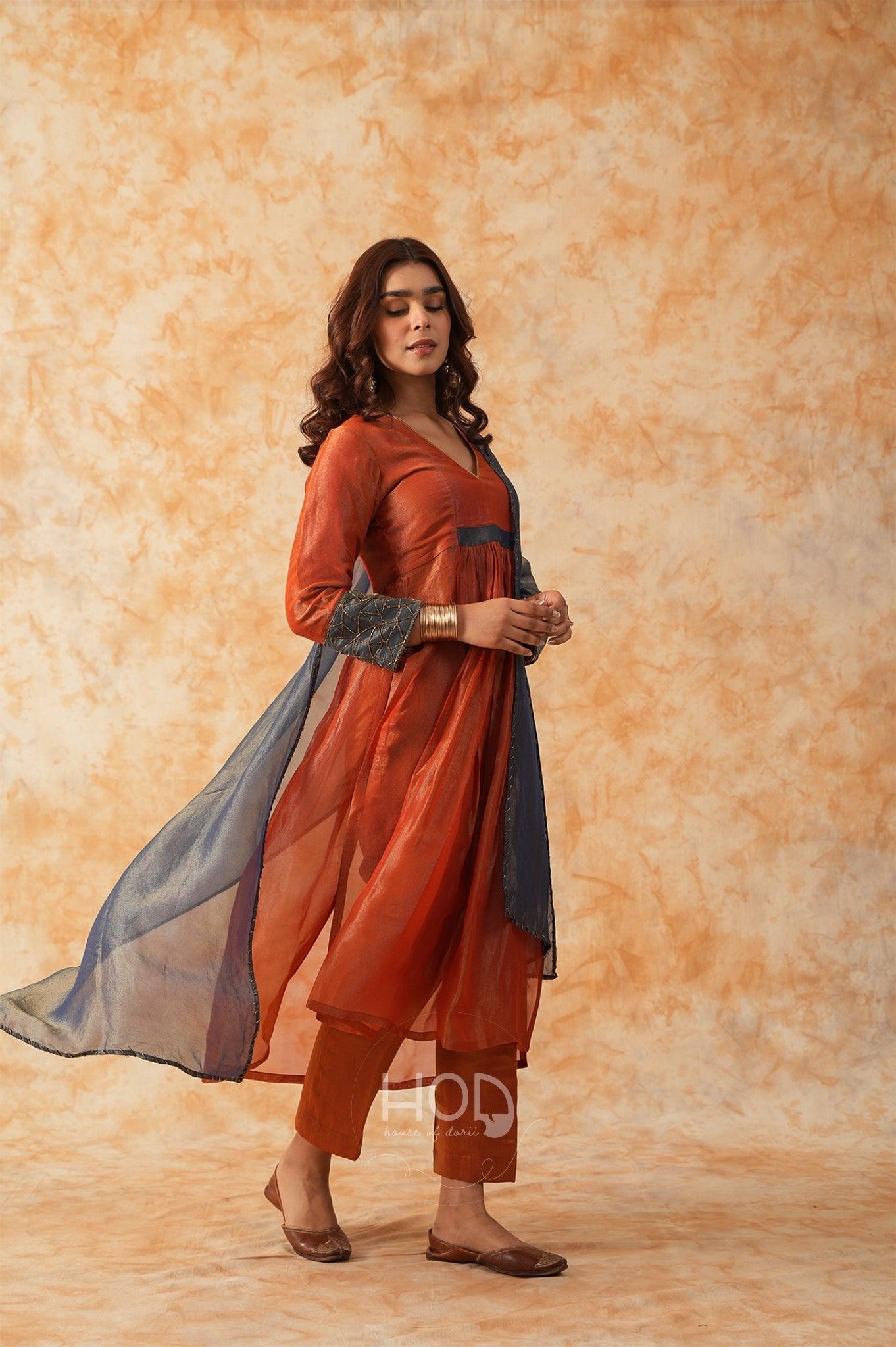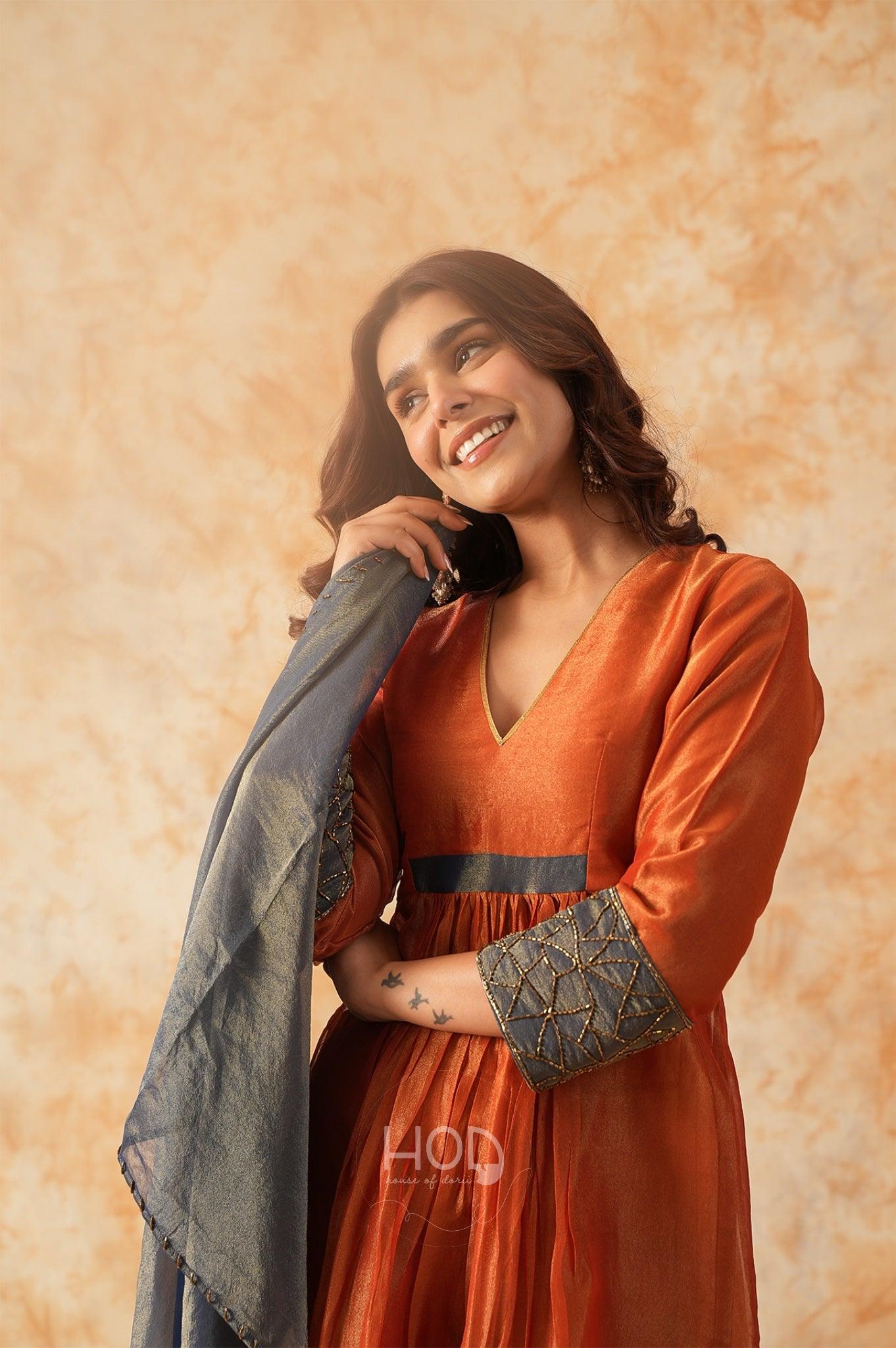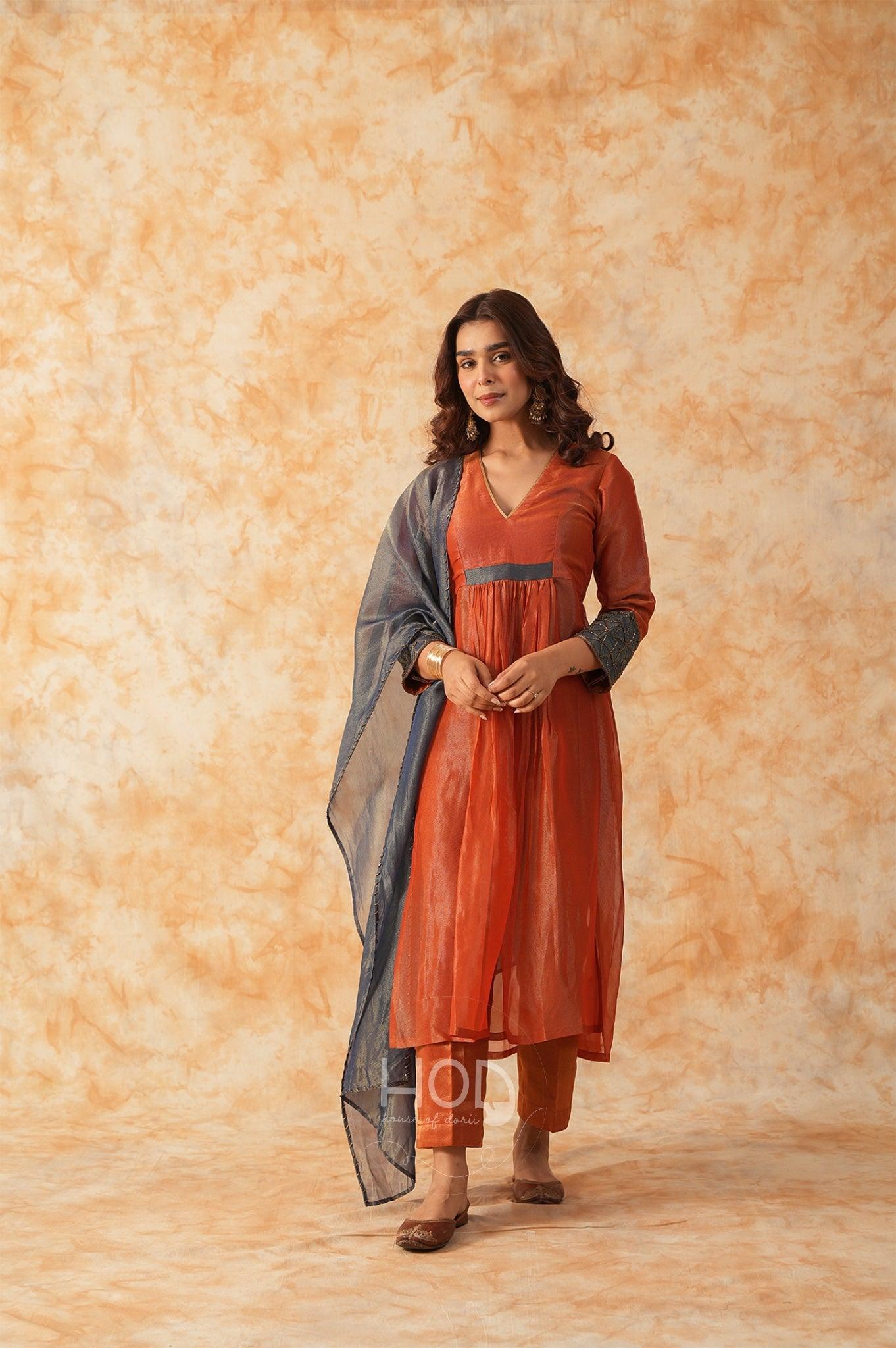 Our Firozi Rust suit set as the name suggests is a blend of man made silk and crisp tissue, which gives a golden tint of pop when worn righteously with minimum accessories, and jewels.