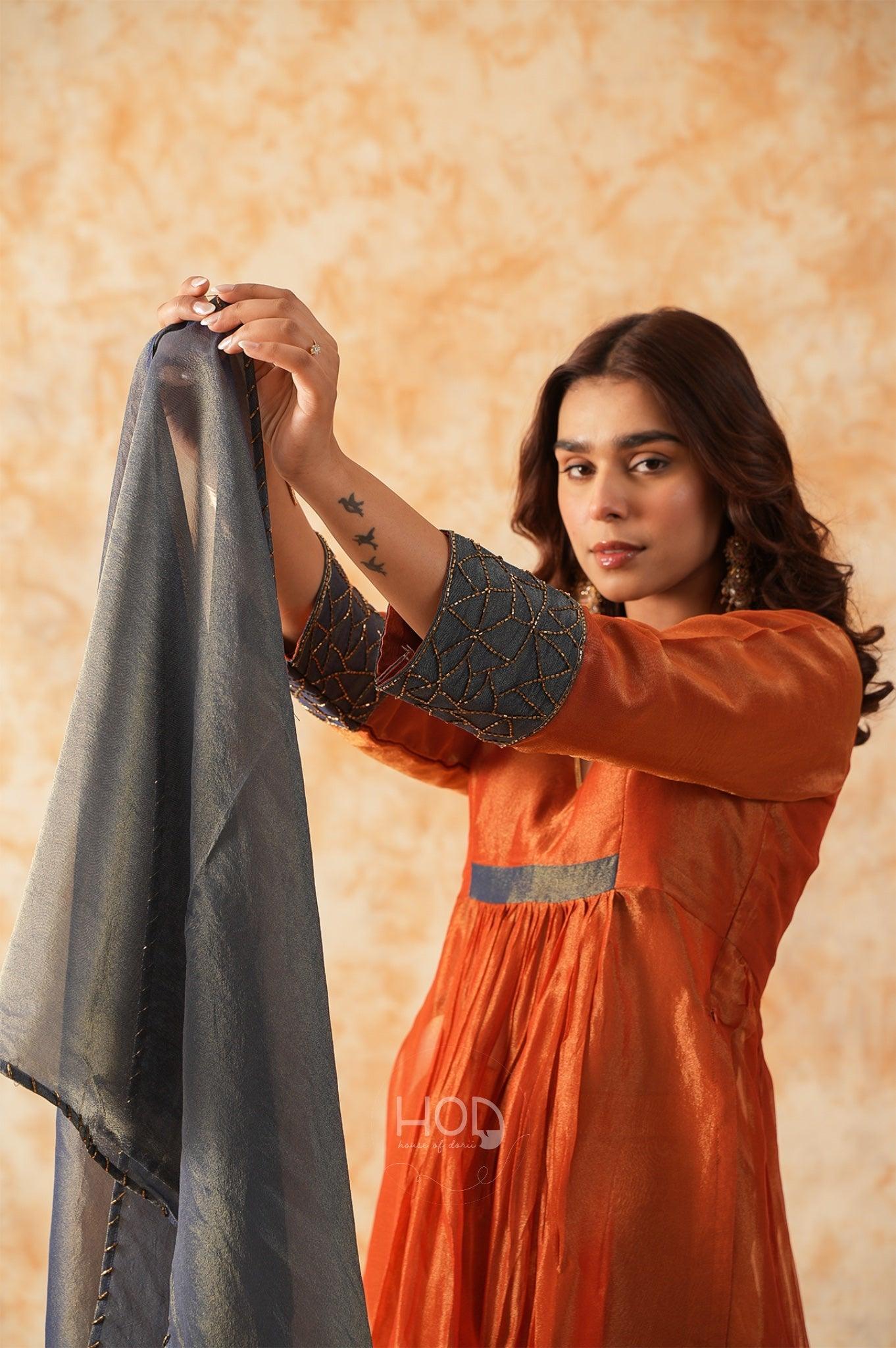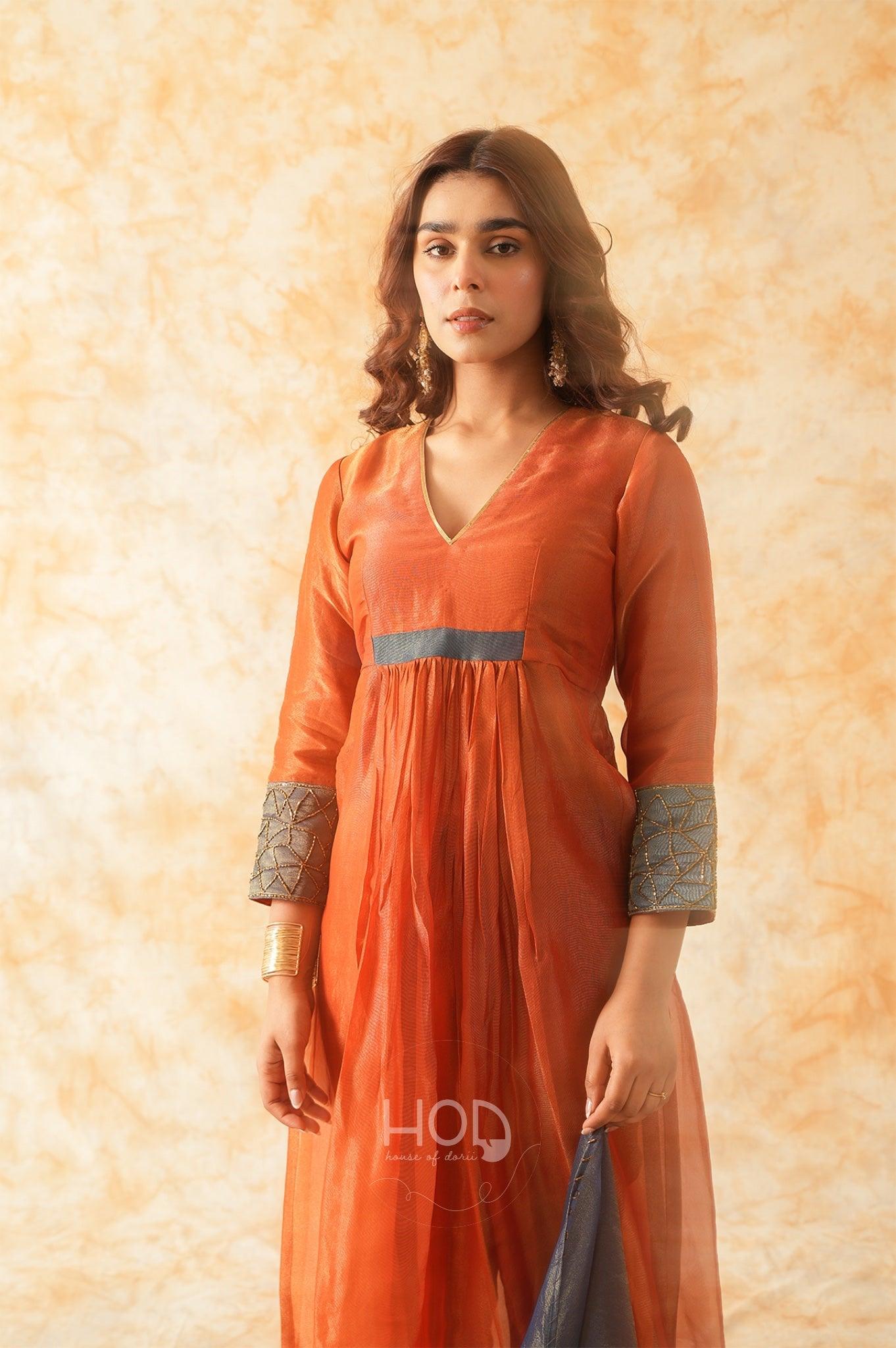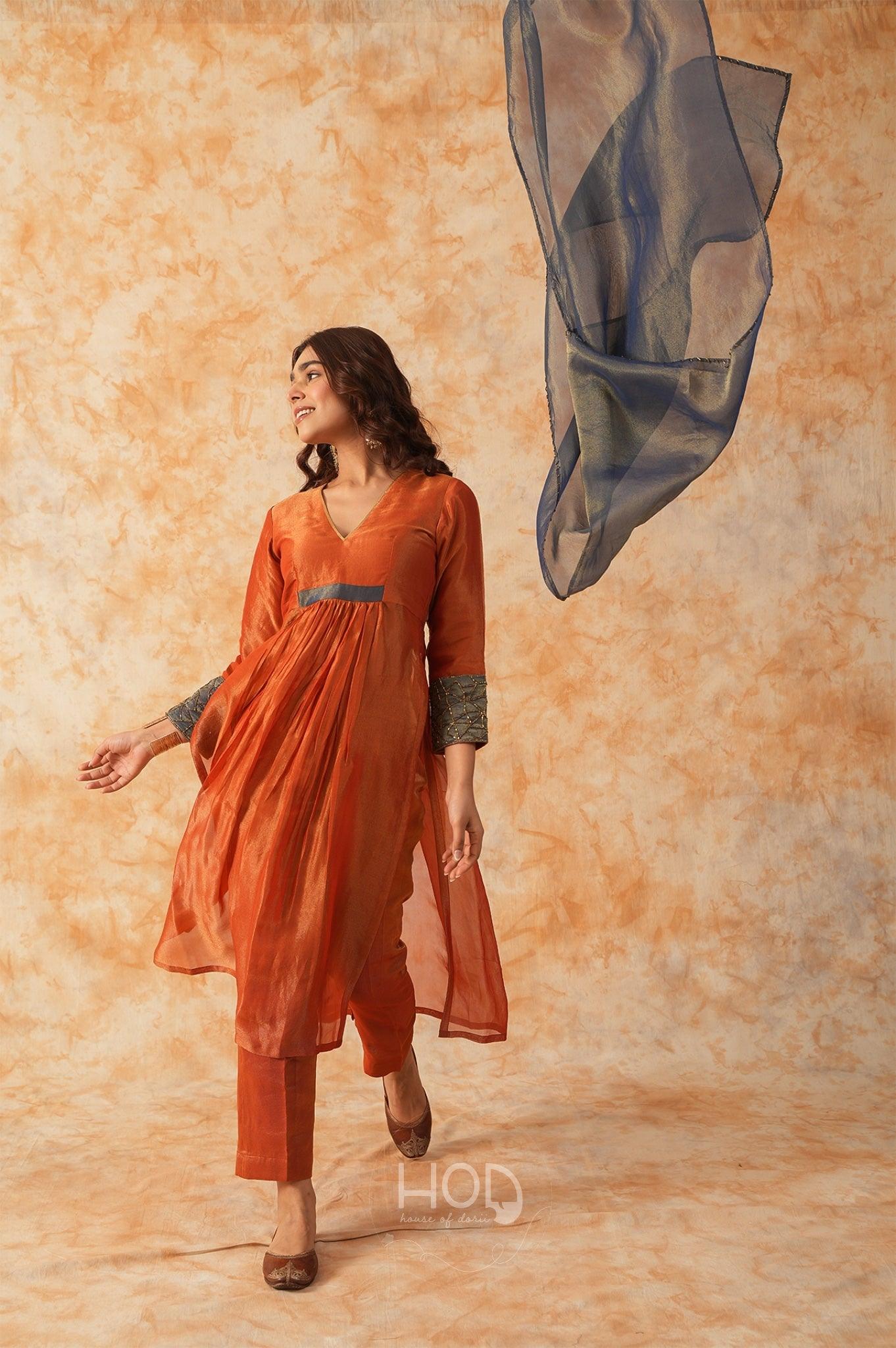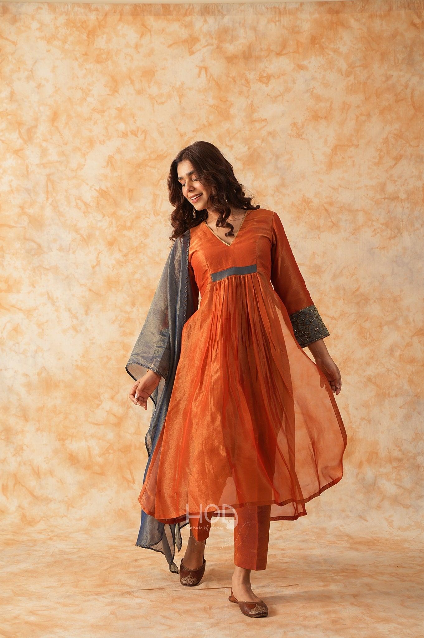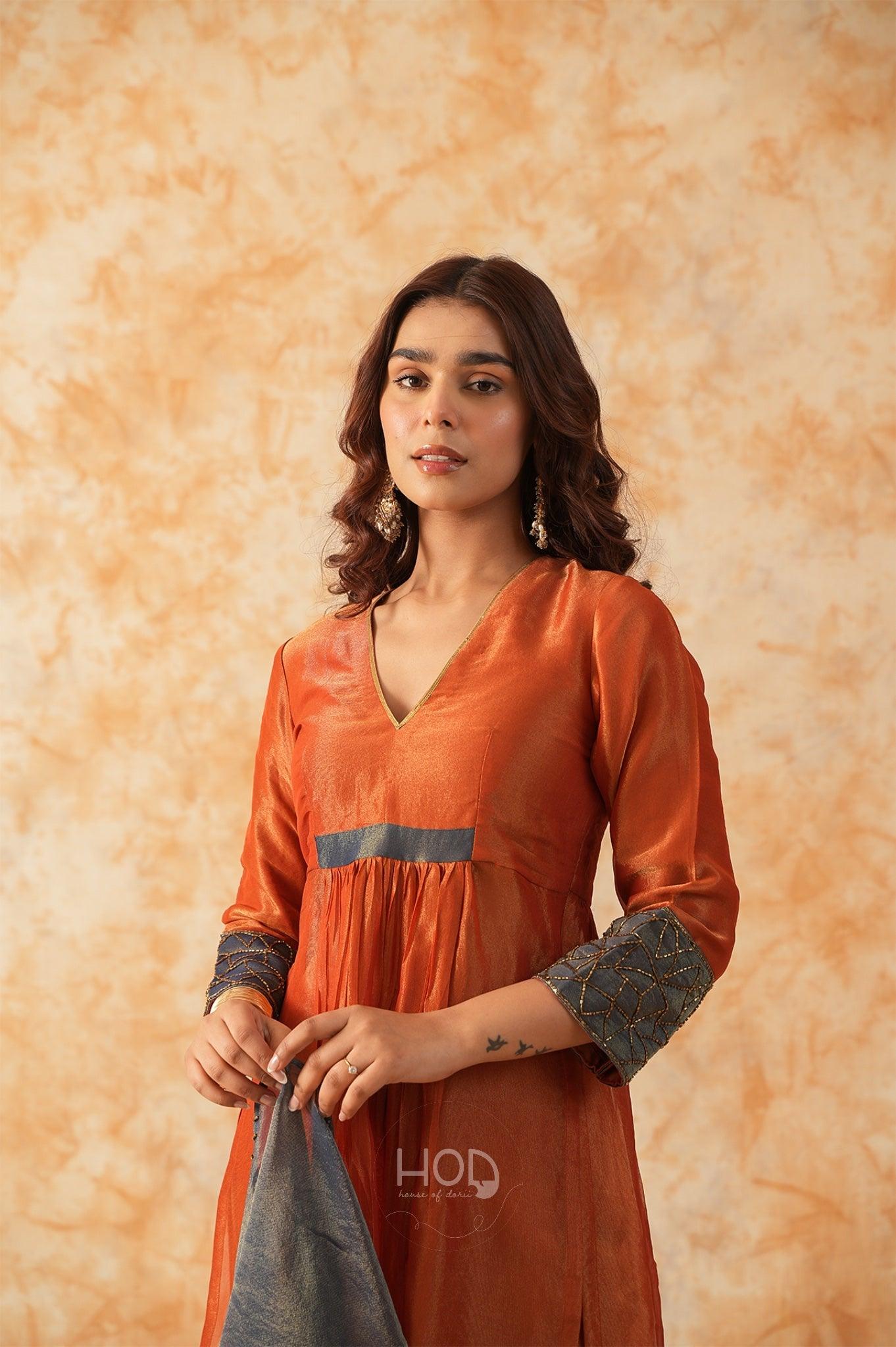 Our Firozi Rust suit set as the name suggests is a blend of man made silk and crisp tissue, which gives a golden tint of pop when worn righteously with minimum accessories, and jewels.