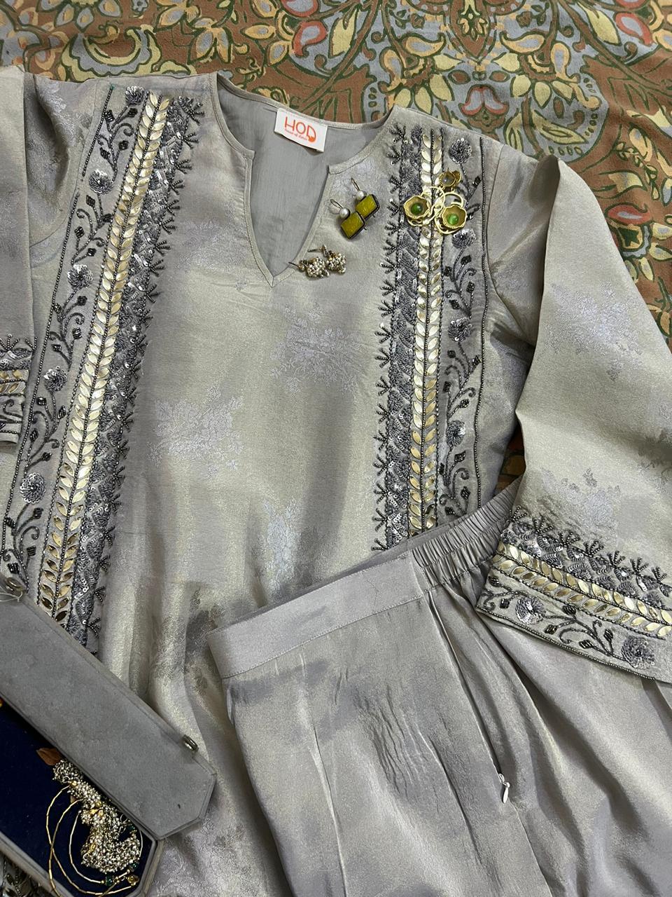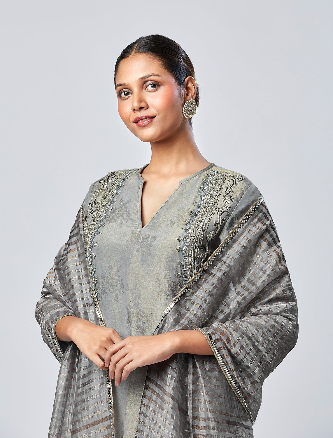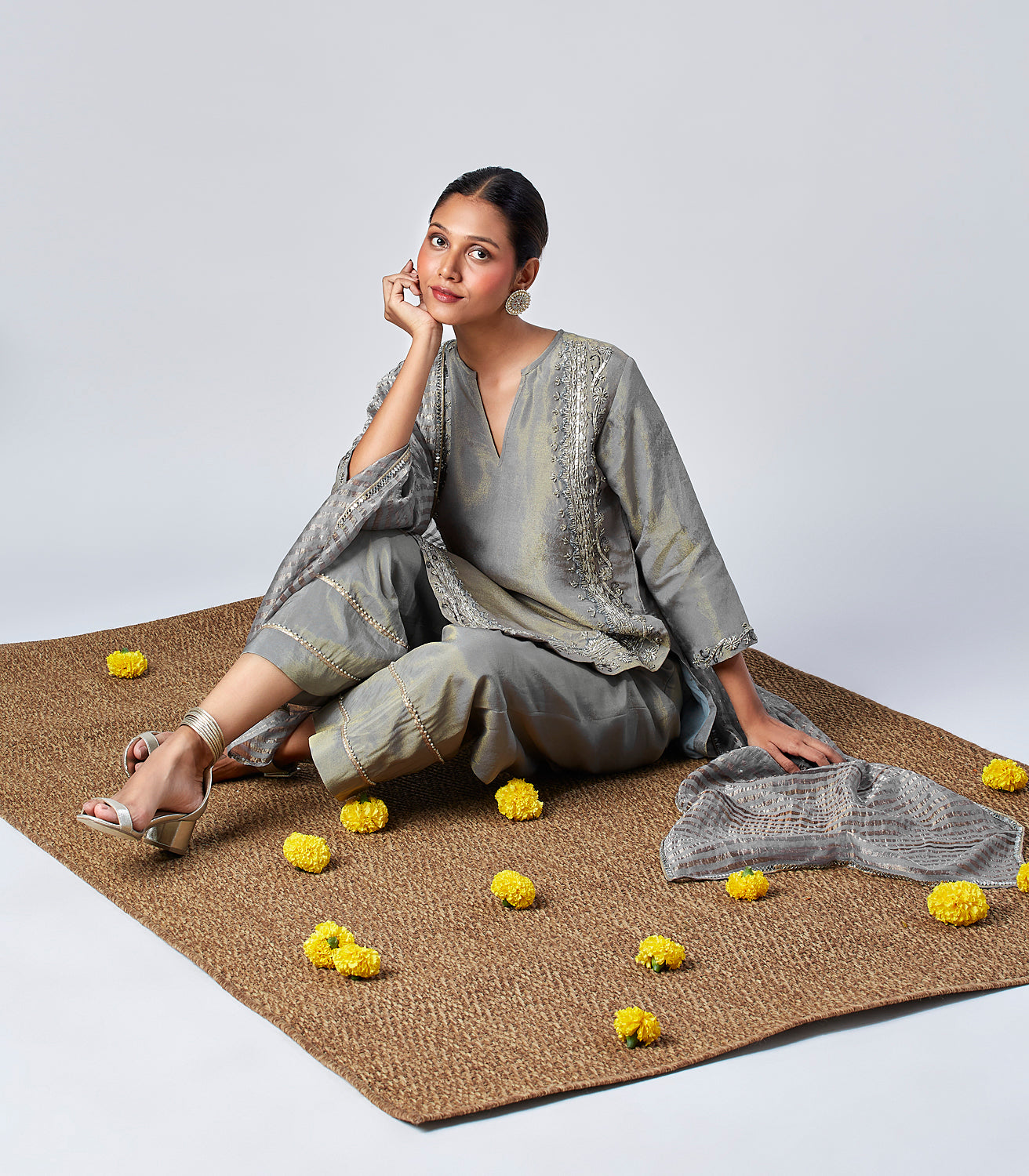 Our Silk Tissue Brasso Hand dyed and embroidered set in the hues of grays are to make you fall in love,