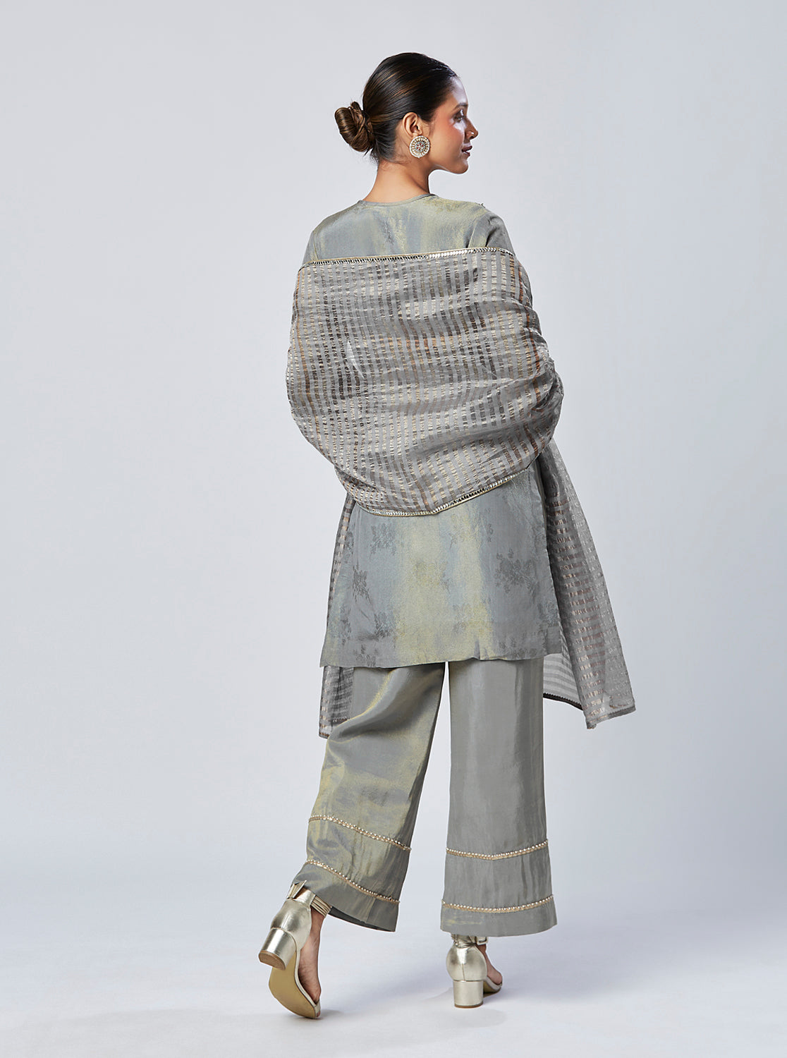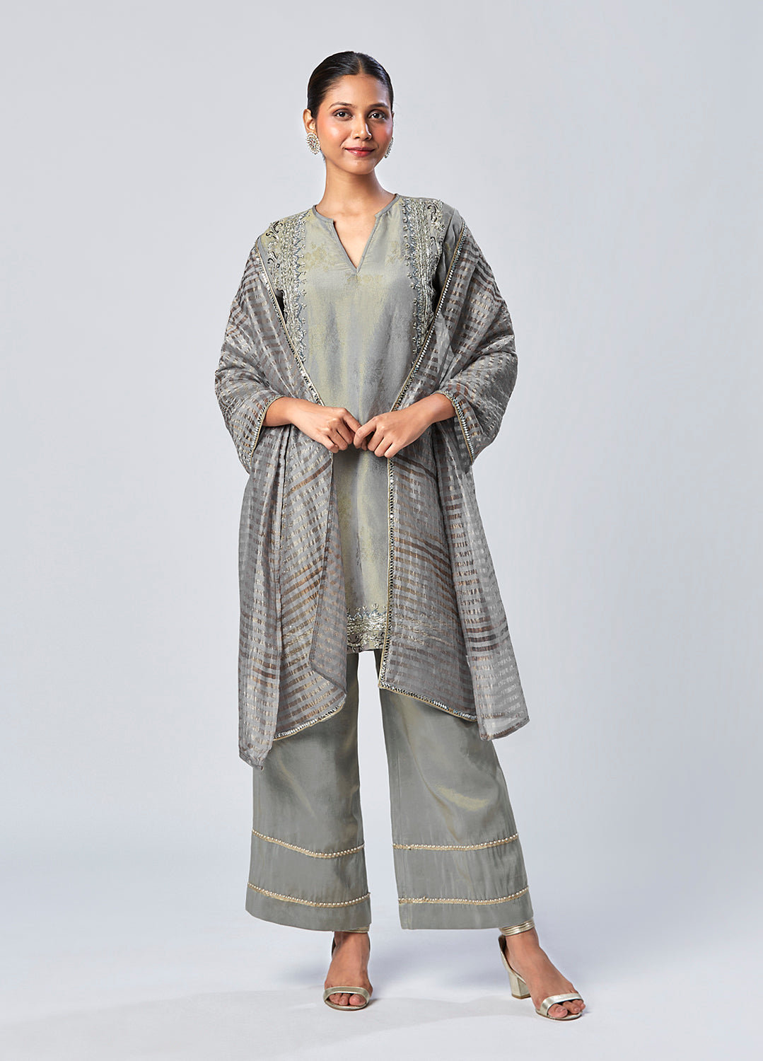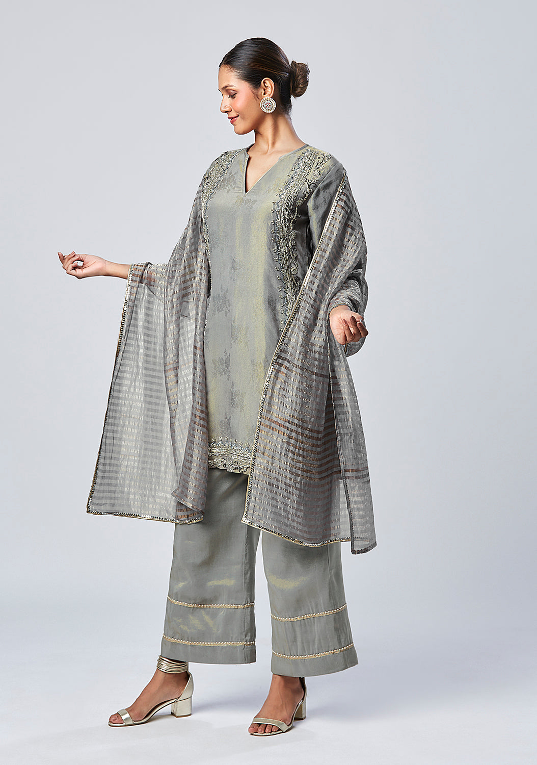 Our Silk Tissue Brasso Hand dyed and embroidered set in the hues of grays are to make you fall in love,