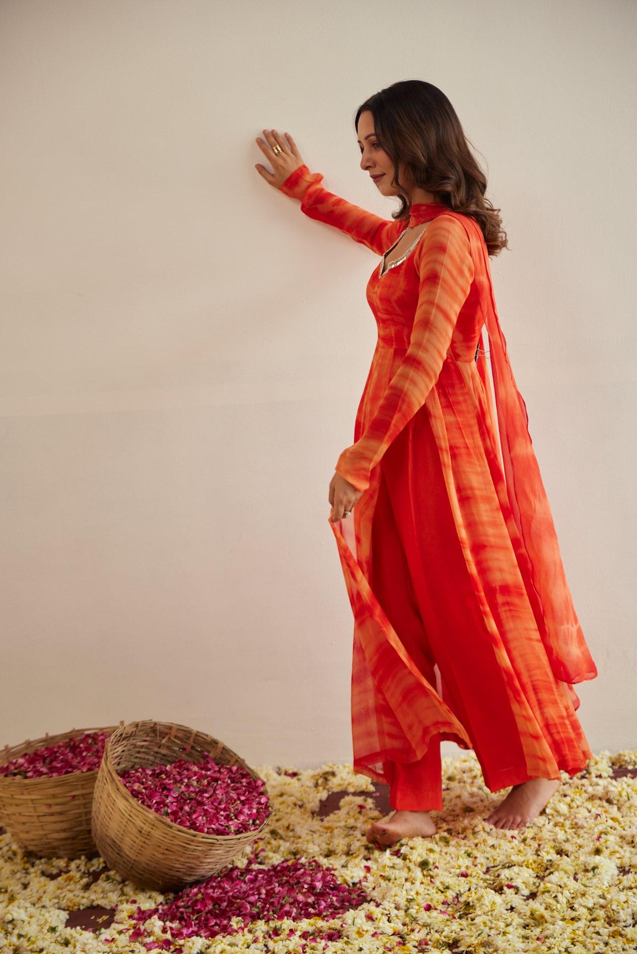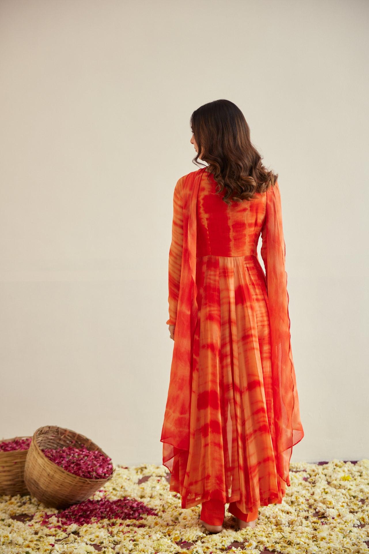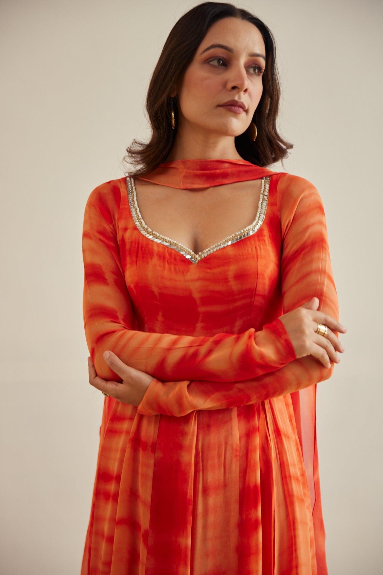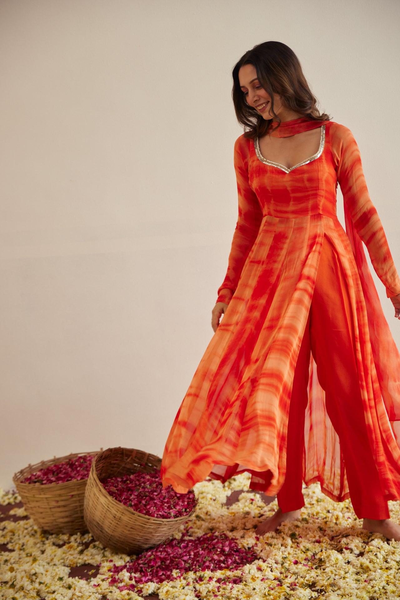 Sun Rise set is a three piece set, which is a blend of hand dying in three different colours with a beautiful pear and mirror detailing in the neck, side slit and kallidar kurta with an elongated sleeves is a cherry on top, dupatta and the pants will compliment the look even more, you would absolutely fall in love with viscose fabric so comfortable and chic.