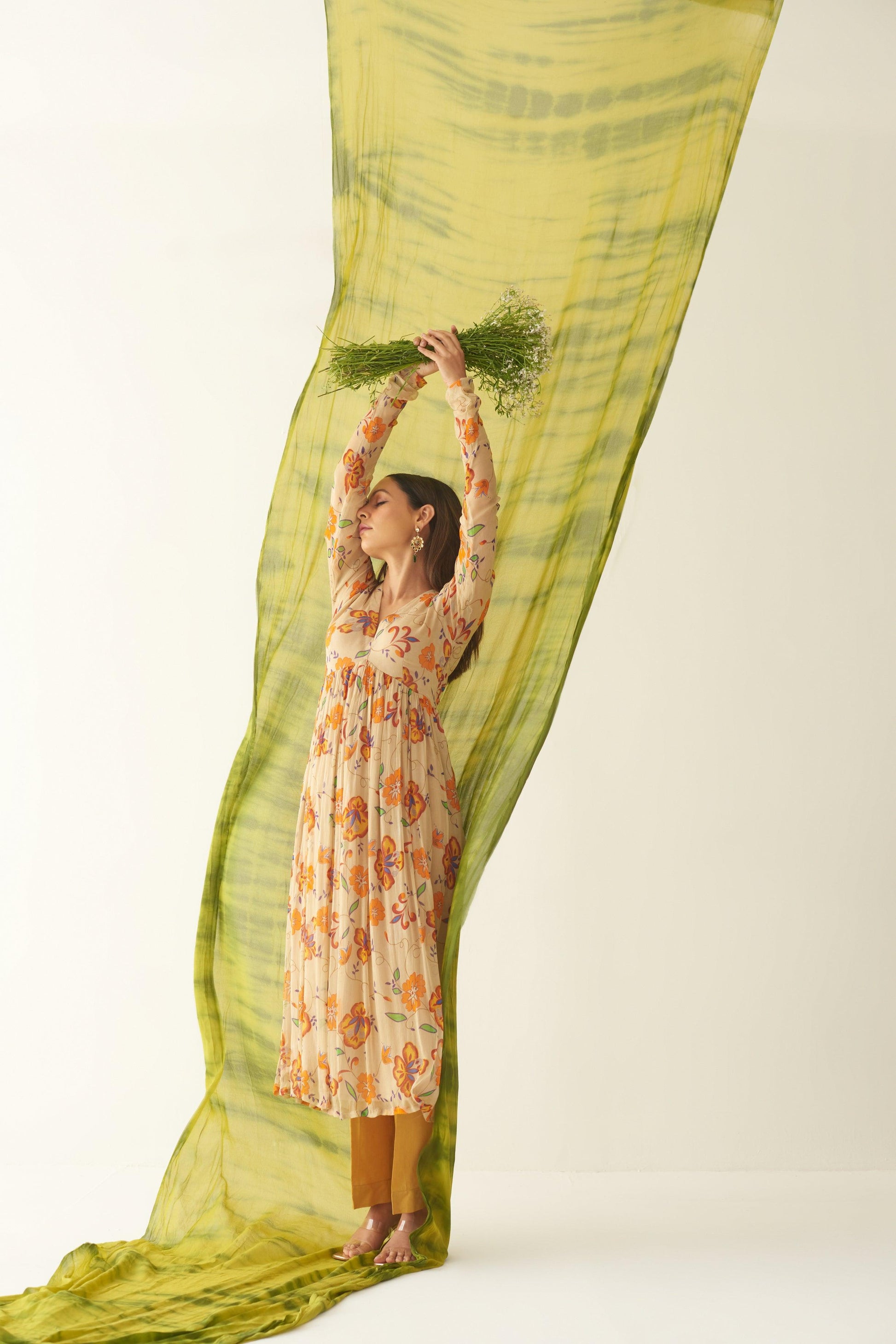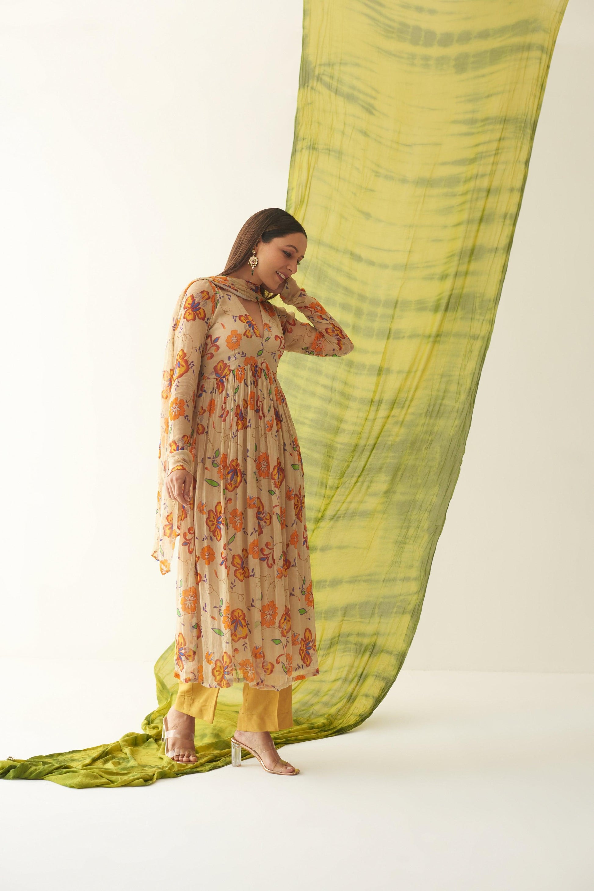 Our subtle SUNFLORAL set is a chiffon blended kurta set which comes with a dupatta and a pants. it is so light and comfy that it literally feels like your own skin. the orange flowers which pop gives an added grace to the whole look.