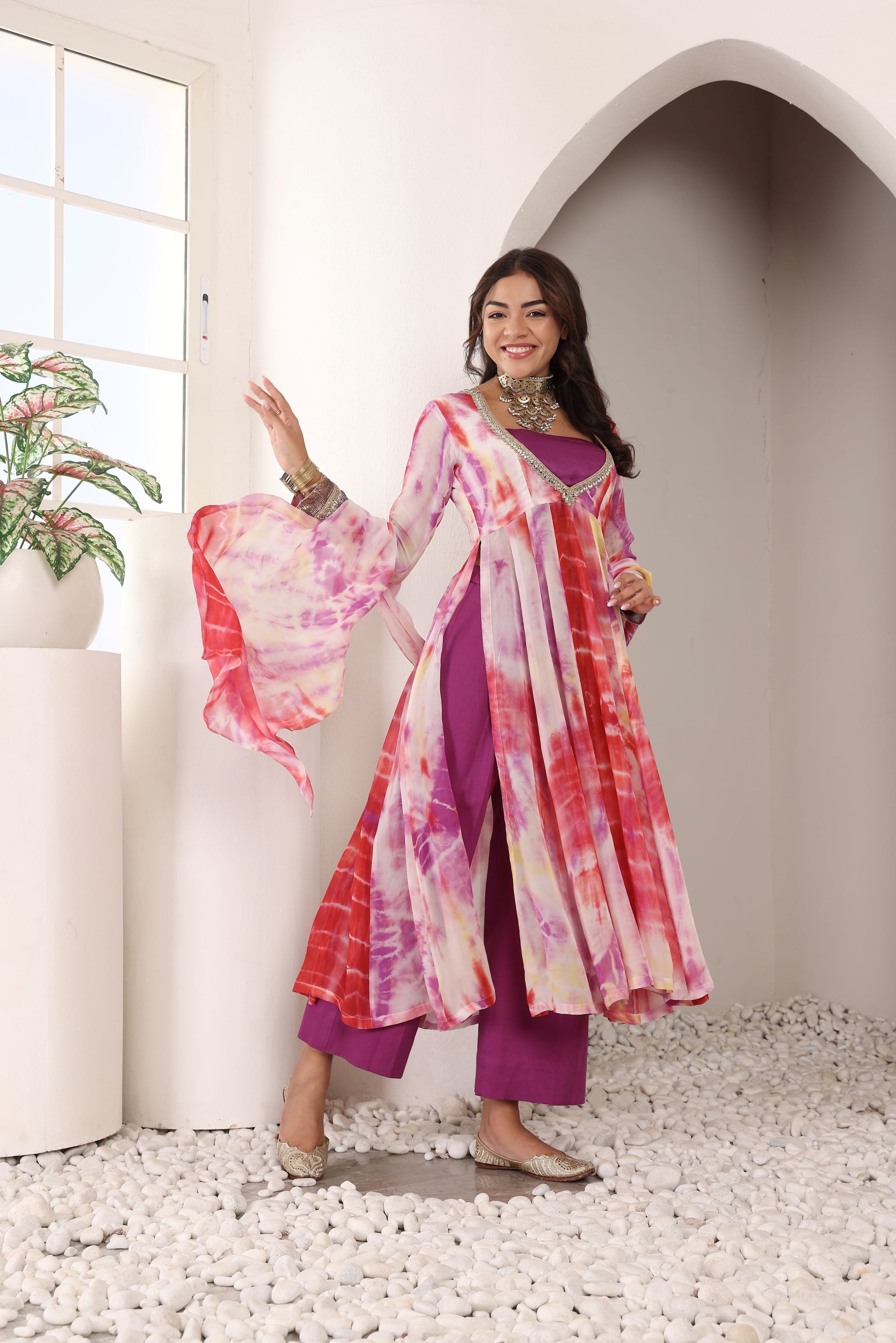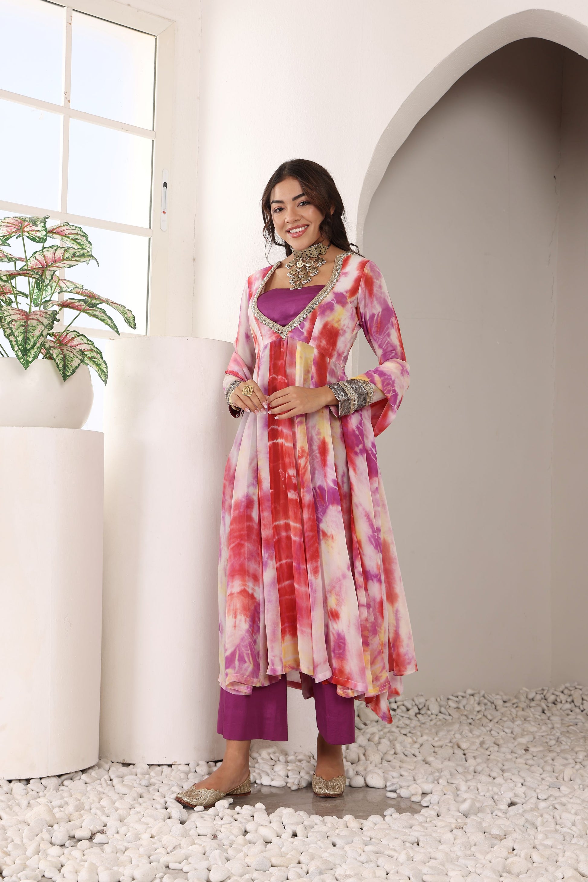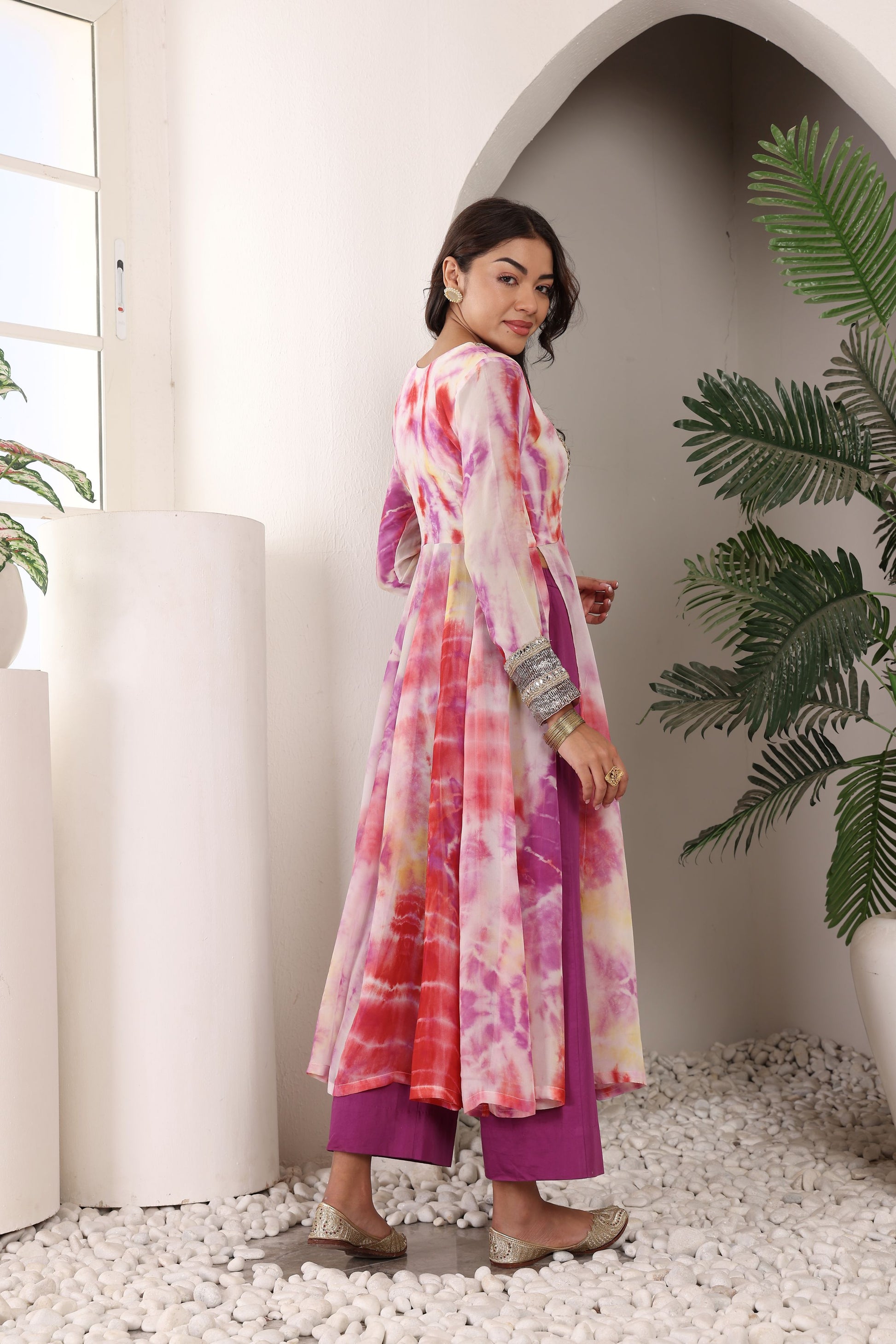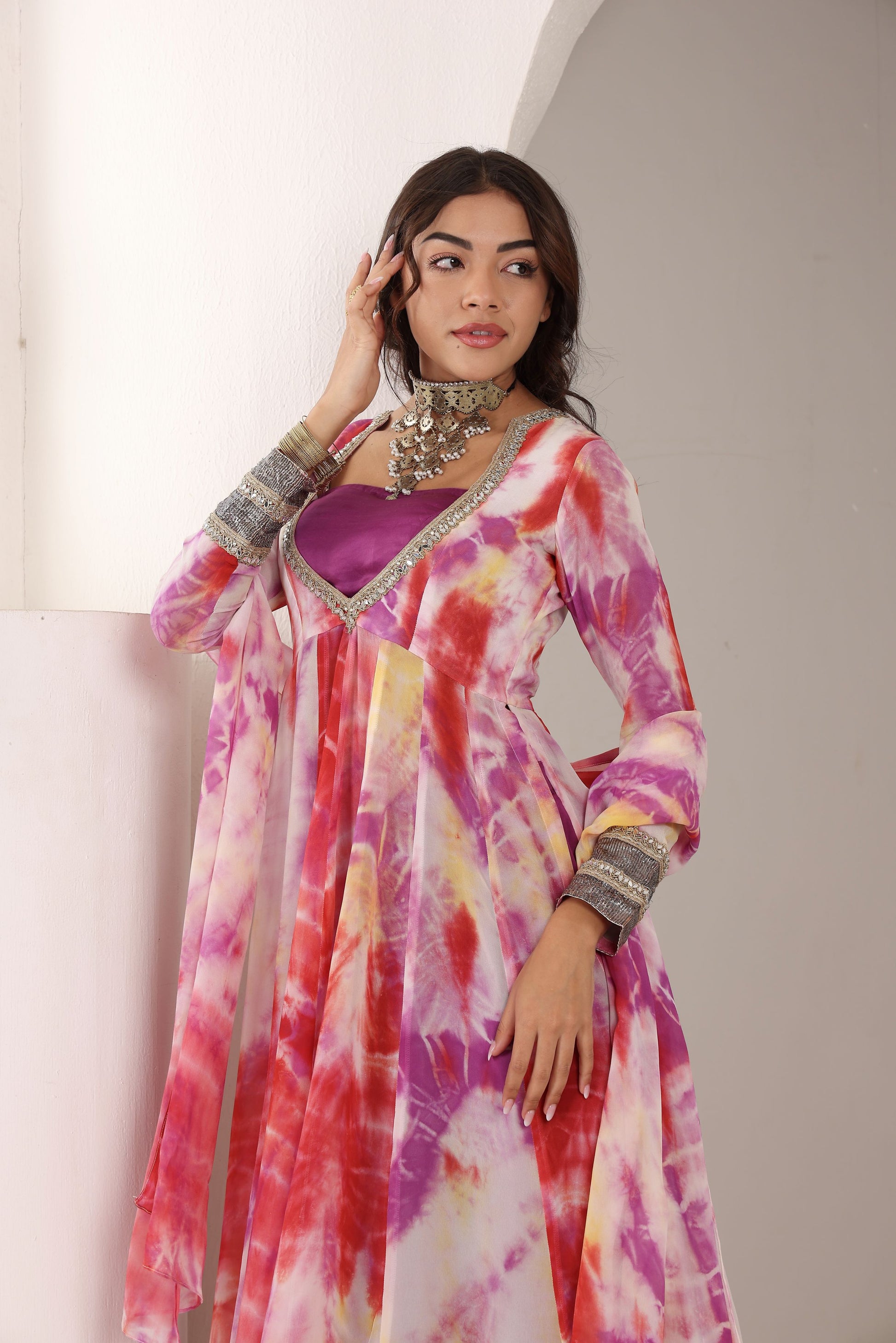 Sunset Swirl, a mesmerizing slit Anarkali kurti set designed for effortless movement and contemporary elegance. Crafted from flowy viscose georgette, the kurti features a plunge V-neckline with intricate border detailing of mirror and pearl, with pure silver embossed lace on the sleeves, adding a hint of allure.Paired with sleek satin cotton pants for a sophisticated touch and complemented by a matching georgette dupatta with delicate border finishing, this ensemble is perfect for festive occasions, evening parties, and modern ethnic styling.