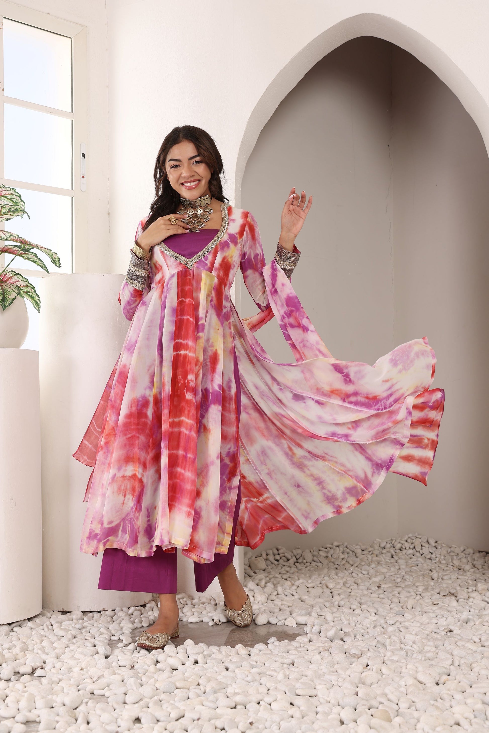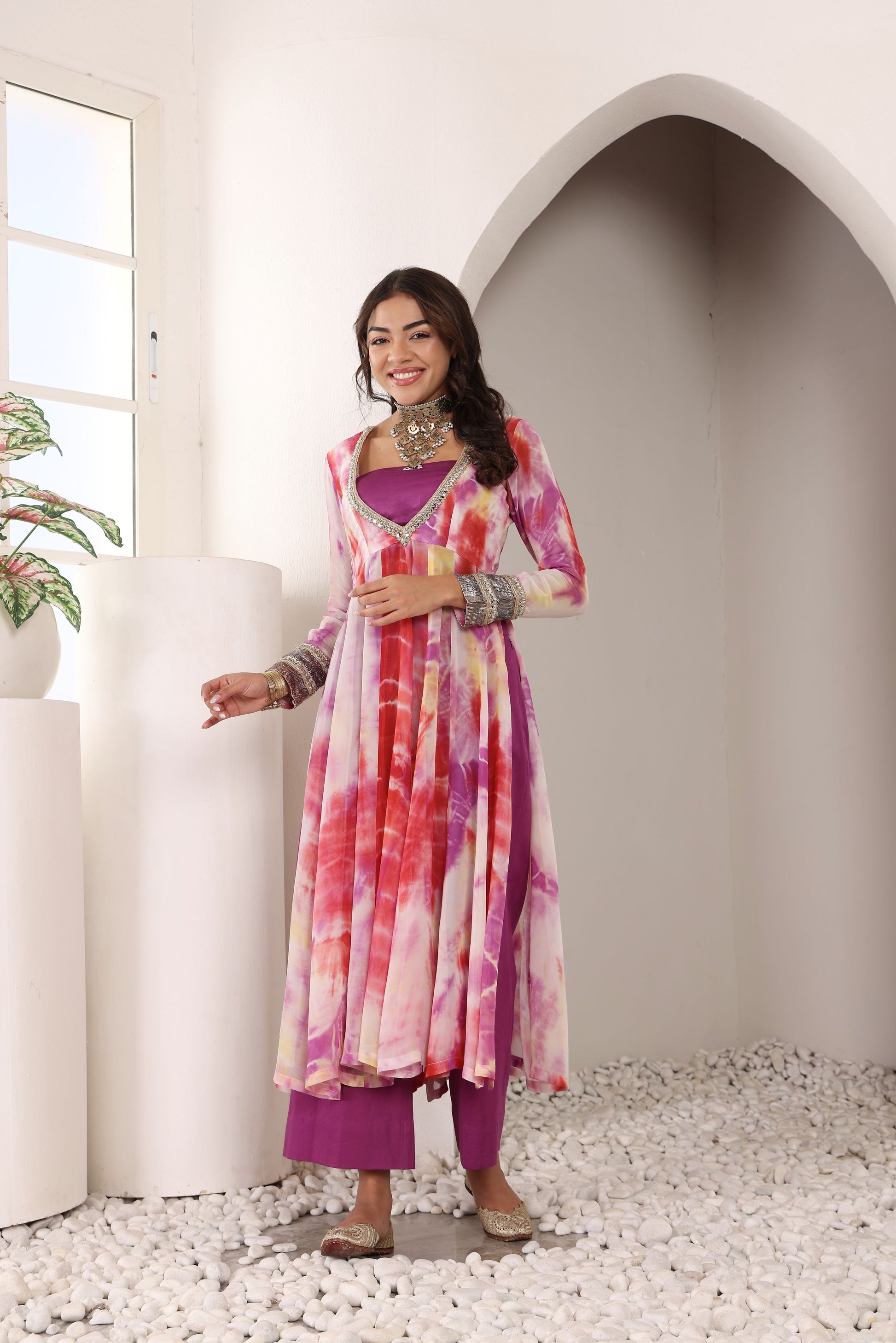• Silhouette & Fit: A flattering slit Anarkali cut, allowing for graceful movement and contemporary charm